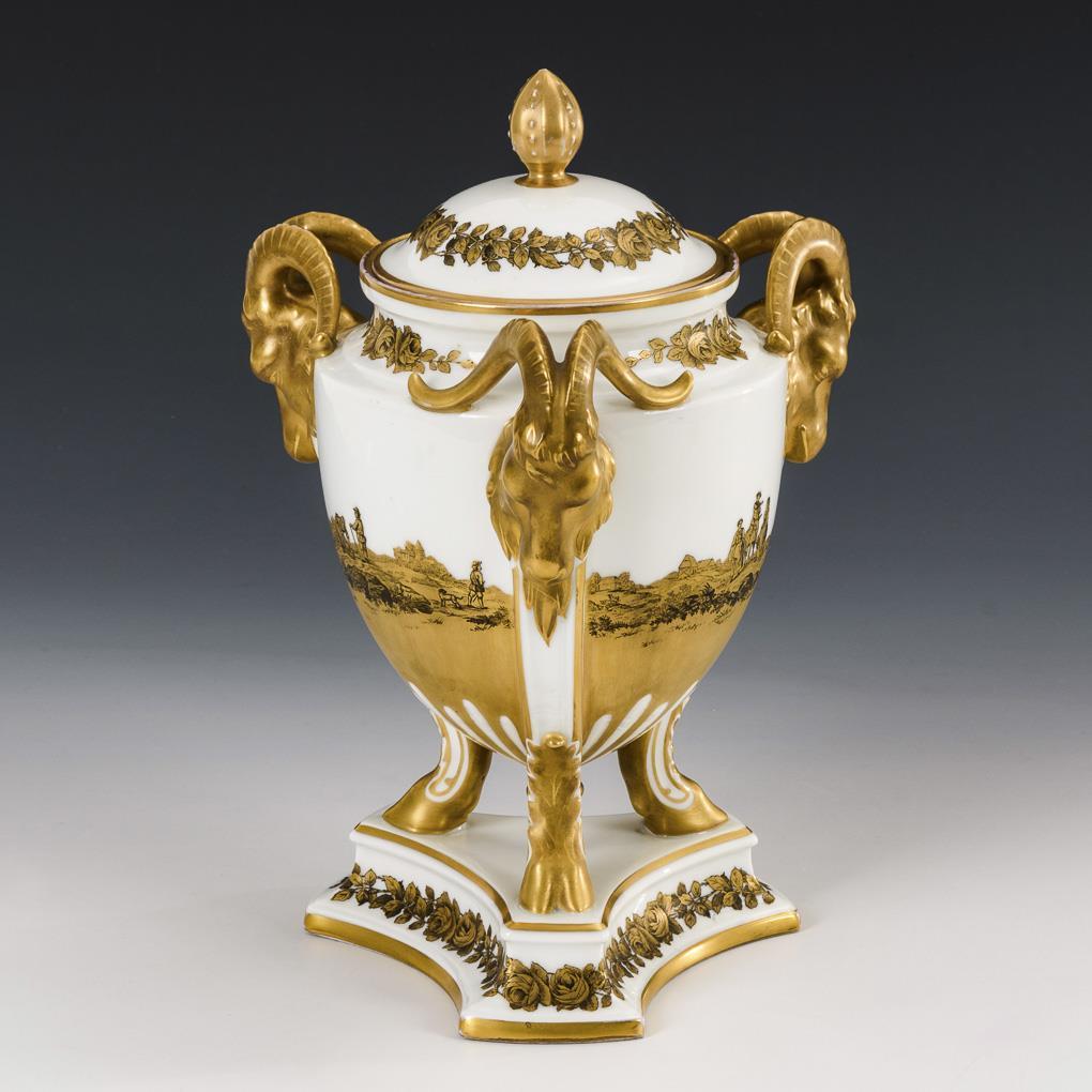 Semi-ovoid vase with three ram's head handles and pommel lid, on moulded plinth. All sides a landscape depiction with figures and architecture. Minimal gold abrasion.