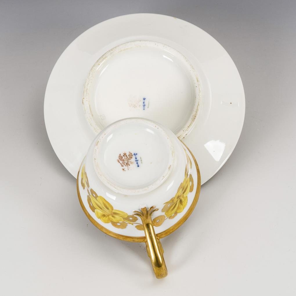 Polychrome painted, richly decorated in gold. H cup 7 cm, Ø original saucer 16 cm.