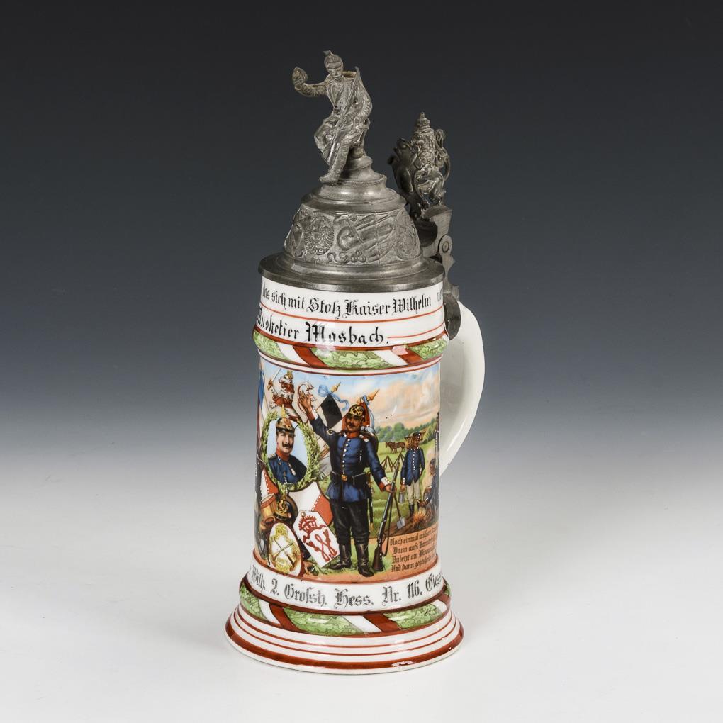 Half-liter jug with portrait of emperor and soldier scenes and mottoes. "Musketeer Mosbach 8th Comp. Inft. Rgt. Kaiser Wilh. 2nd Grand Hess. No. 116". Relief pewter lid with lion back and infantryman crowning. Harris spider on the bottom, name list rubbed.
