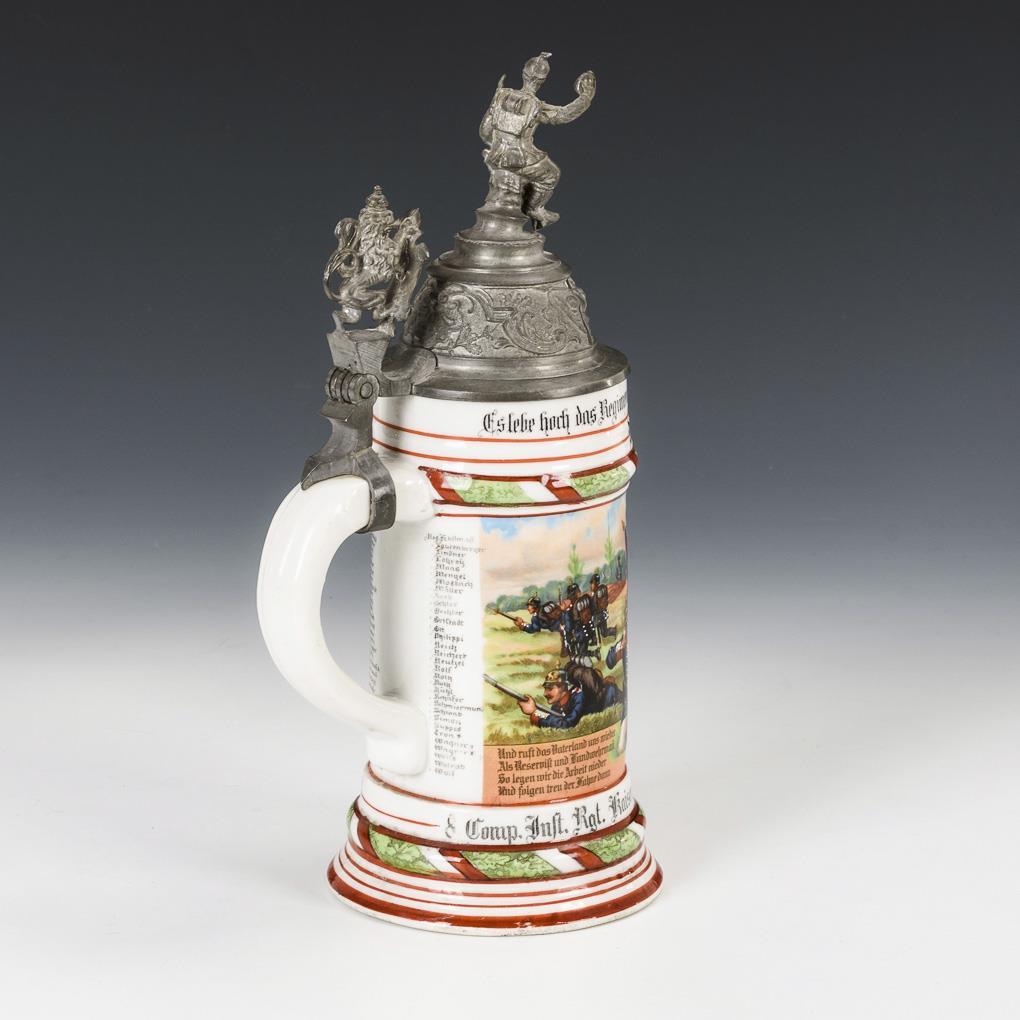 Half-liter jug with portrait of emperor and soldier scenes and mottoes. "Musketeer Mosbach 8th Comp. Inft. Rgt. Kaiser Wilh. 2nd Grand Hess. No. 116". Relief pewter lid with lion back and infantryman crowning. Harris spider on the bottom, name list rubbed.