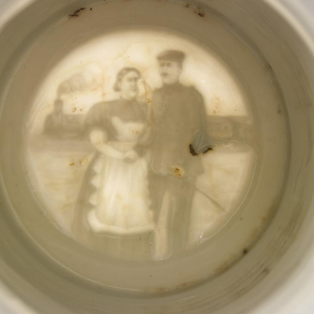 Porcelain with bottom lithophane (farewell scene in front of the railroad), colored preprint, written list of names, tin lid. H 27 cm.