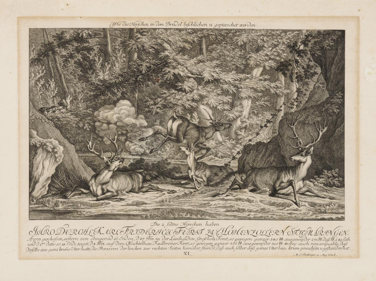 "How the Stags in the Hatchery are Stalked and Stalked", plate: 26.5 x 37 cm, sheet: 34.5 x 45.5 cm, one spot pasted behind, foxing, light damage | "An Iagtbahrer Citizen Stag of 10. Änden [...]", sheet: 34 x 41 cm, sheet trimmed, light damage, back-taped tear in lower margin | "Diser Hirsch Ist von Sr. Hochgräffl. Excellenz [...]", plate: 37 x 28 cm, sheet: 46.5 x 36 cm, light damage, probably younger reprint.