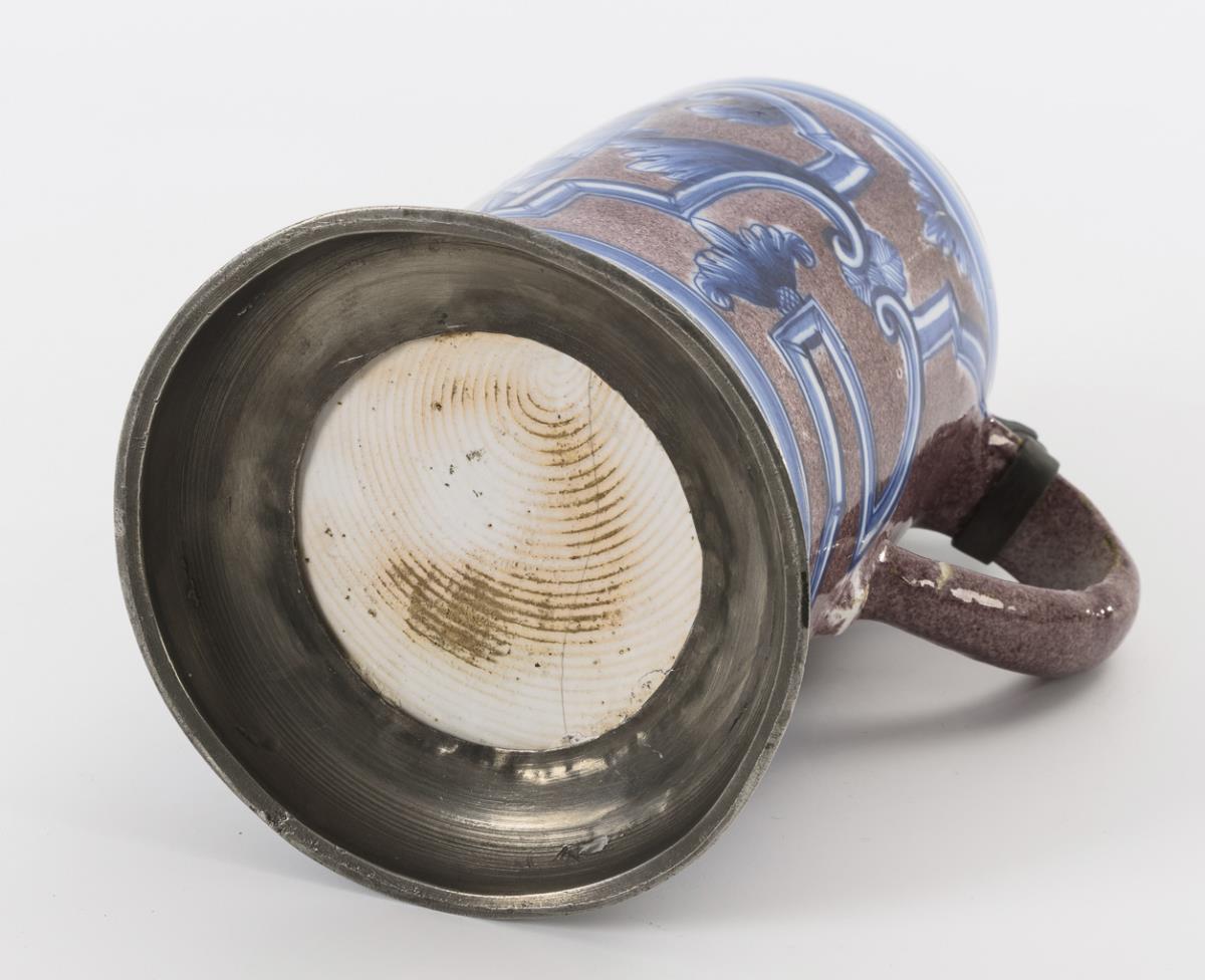 Cylindrical jug with manganese-glazed wall and ribbon handle. On the front a crowned baroque reserve with landscape flanked by ribbonwork. Profiled pewter lid with ball pusher, pewter standring. Fine cracks at the mouth and in the bottom area, partial bumps and light rubbing on the glaze.
