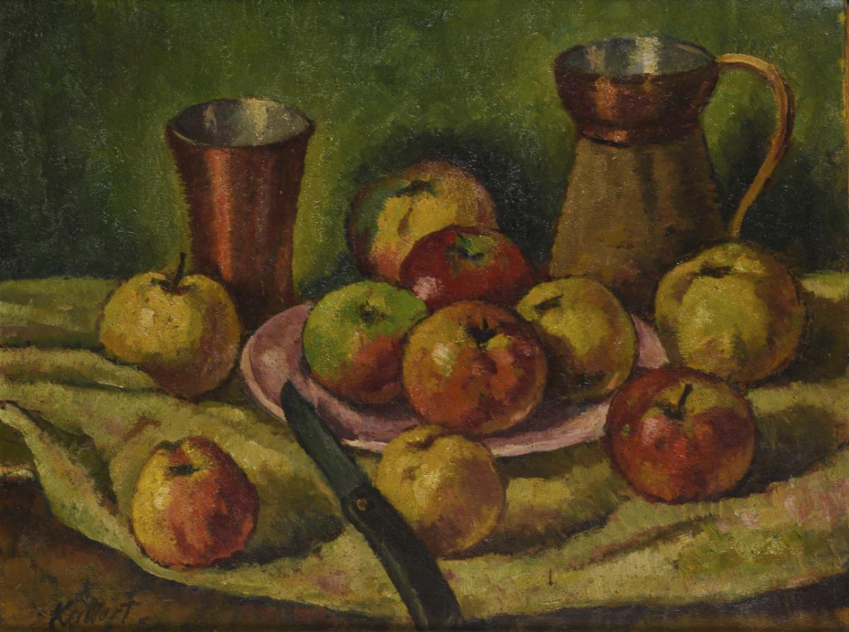 The apples on a table with knife, cup and jug. Slight signs of age.