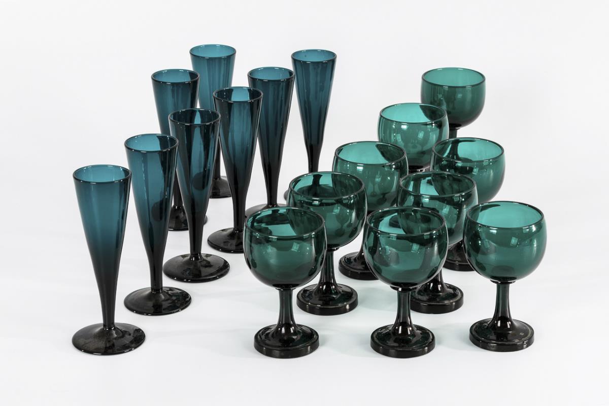Petrol coloured glass. 9 wine glasses (h 12 cm) and 8 champagne glasses (h 16 cm).
