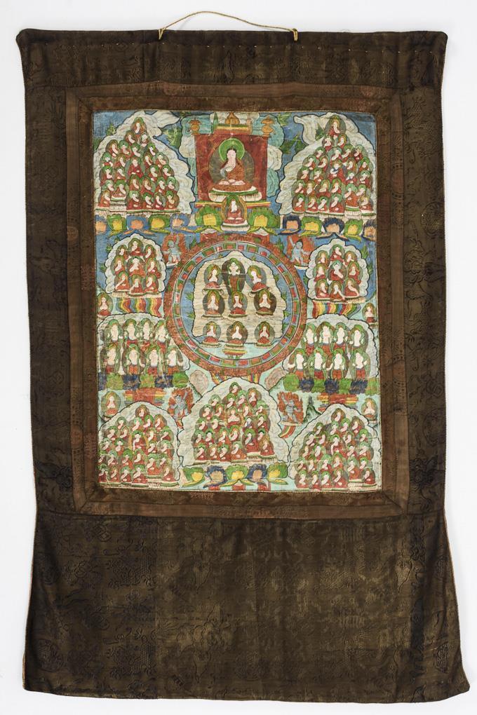 Buddhas arranged in groups on blue-green ground. Bound in dark brown patterned silk. Inscribed "Chimpang Mandala" on the reverse. With hanging.