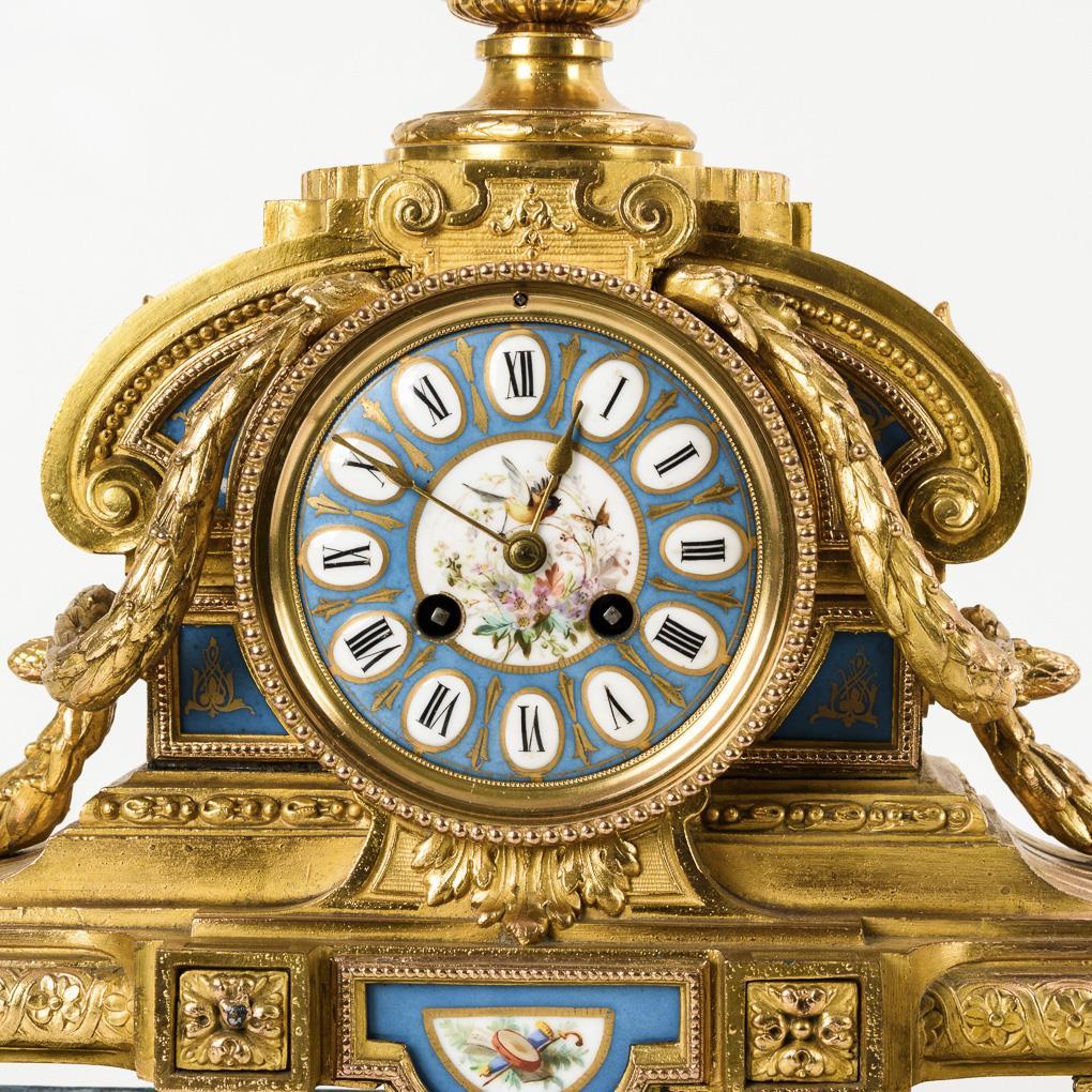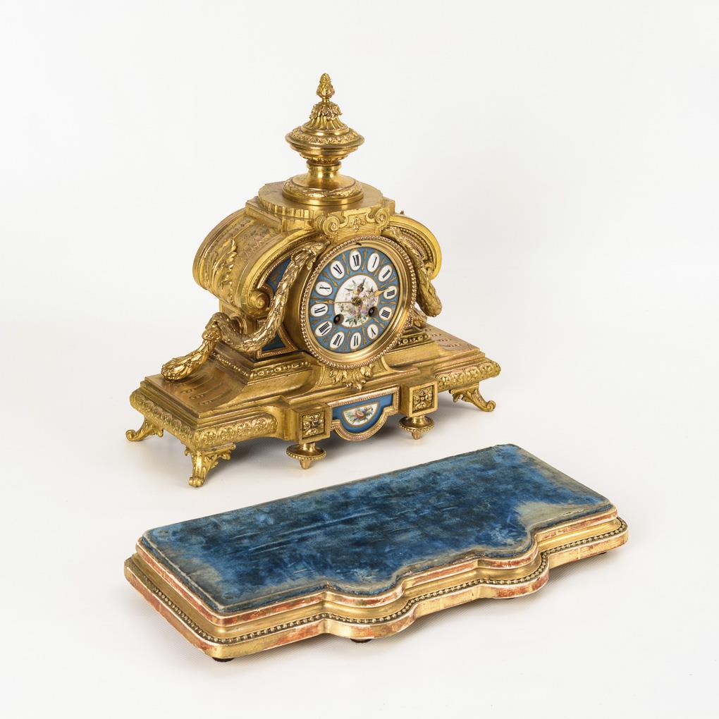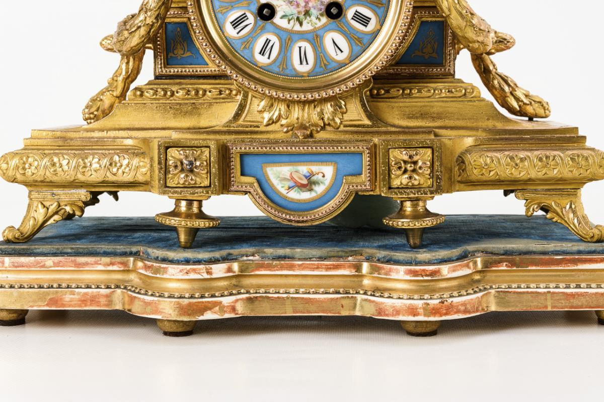 Neo-Baroque clock with classical decorative elements and vase crowning. Front light blue porcelain inlays with coloured bird and instrument painting and gold staffage. On stucco-gilded profiled wooden base with blue velvet cover. Signs of age and partly heavier use.