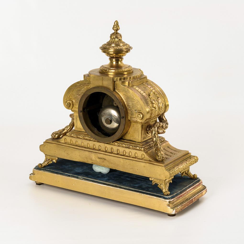 Cast metal and brass, gilt. Clock 34 x 34 x 15 cm | base 5 x 38.5 x 18 cm.