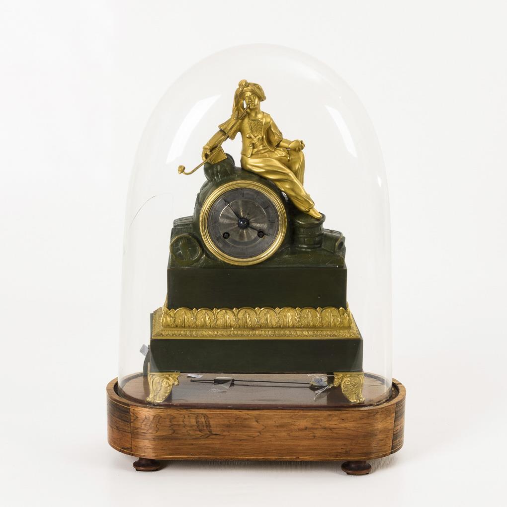 Bronze, gilt and greenish patinated. Clock 32.5 x 22.5 x 9.5 cm | glass dome H total 43.5 cm.