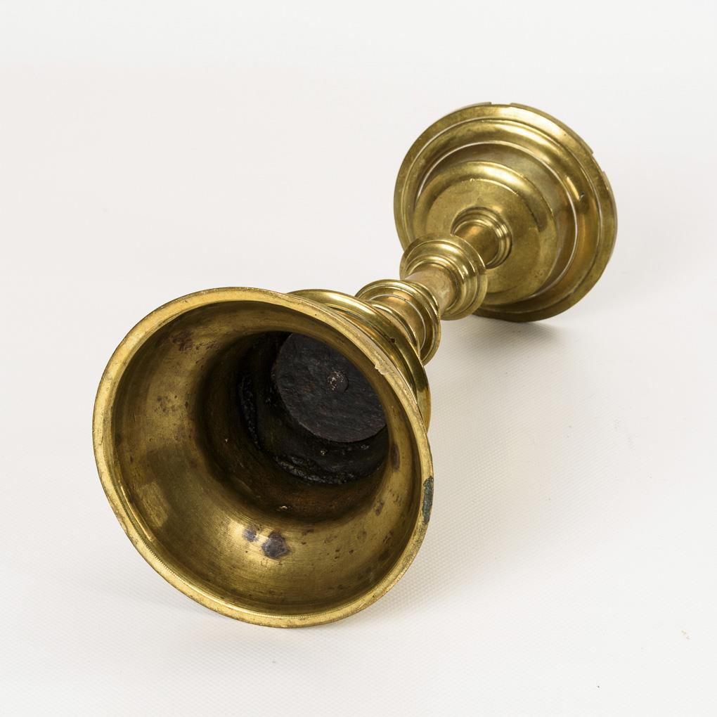 Candlestick with stepped foot, whorled shaft similar to a disc chandelier and wax plate with crenellations and screwed bronze spike. A few signs of age/use.