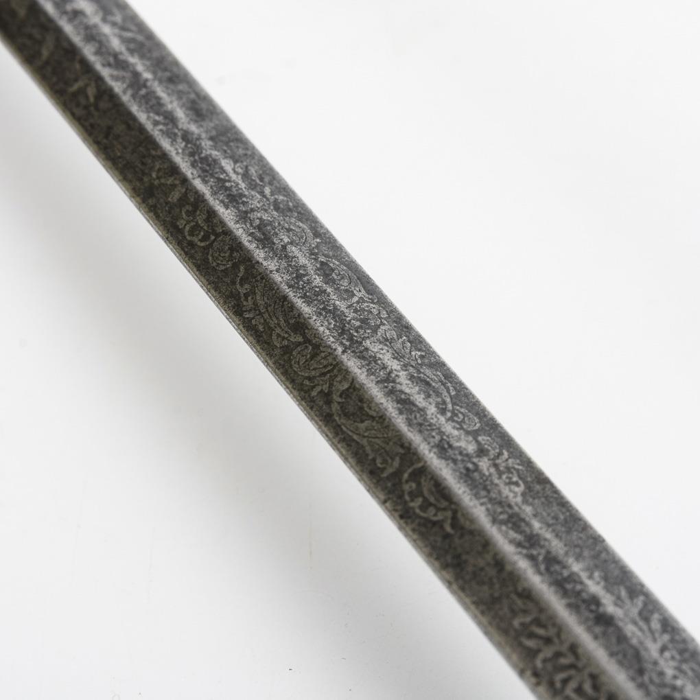 Old style epee with etched ornament on both sides and engraving "Berlin" on the hexagonal blade. Piercing bar broken off, winding renewed, some signs of age/use.
