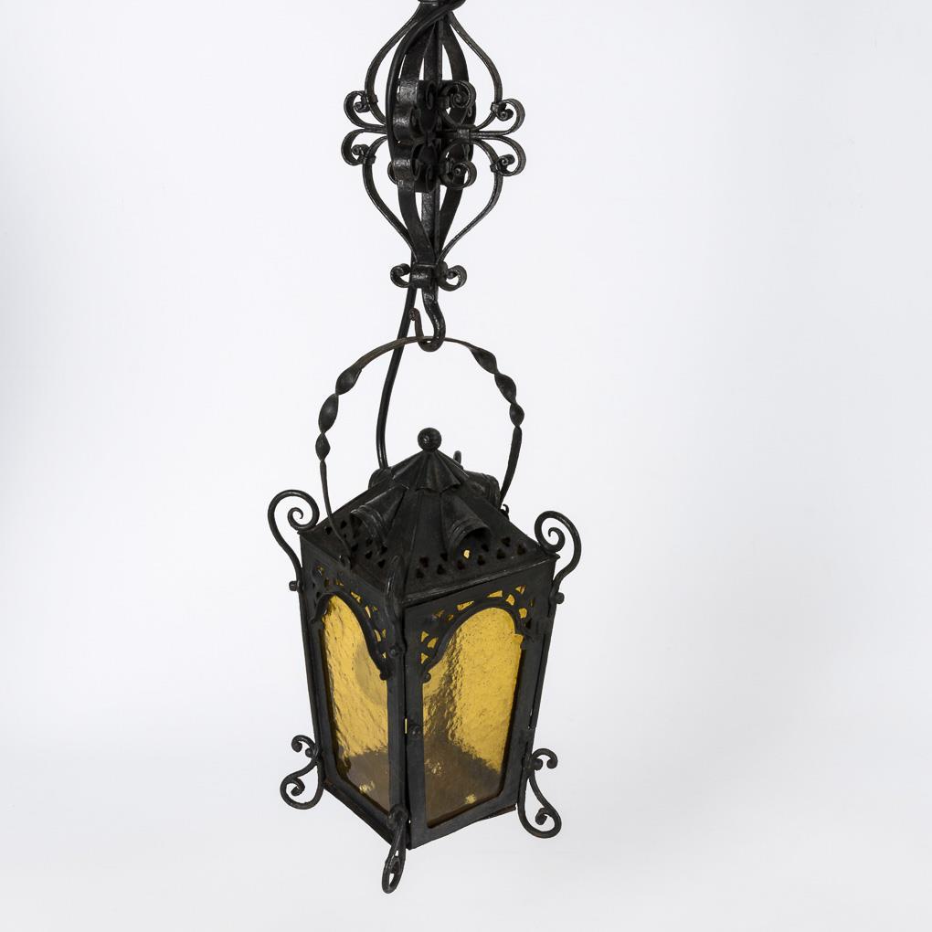 Originally used as a hand and ceiling lamp candle lamp with subsequent electrification. Associated decorative hook with 4-sided wrought. Functioning. Few traces of rust, glazing renewed.