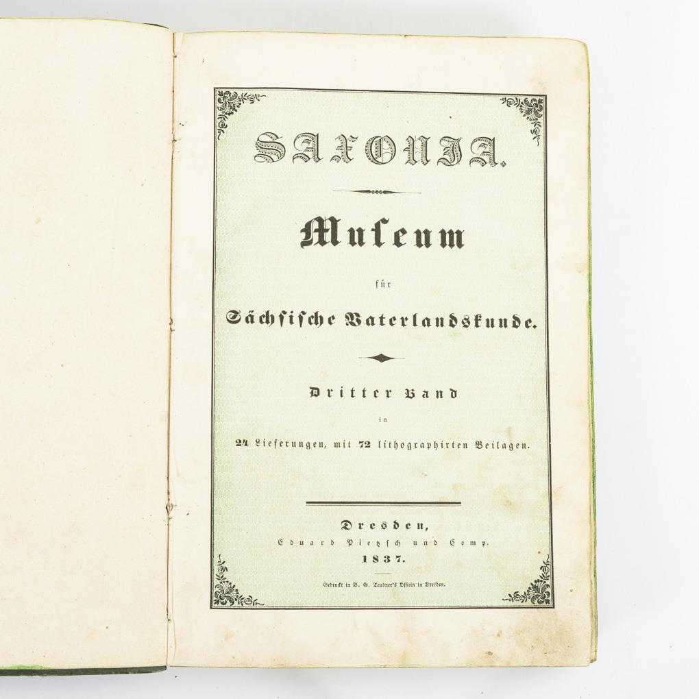 2 volumes "Dresdner Galerie" - "Der Kunstverein, Neue Serie: Stahlstichsammlung der vorzüglichsten Gemälde der Dresdner Galerie". Together 354 pages and very many steel engravings. Red embossed binding with gilt edges. Signs of wear / "Saxonia- Museum für Sächsische Vaterlandskunde" 3rd volume, Dresden 1837. 130 pages and about 66 steel engravings. Stronger signs of age and wear, 2 engravings damaged.