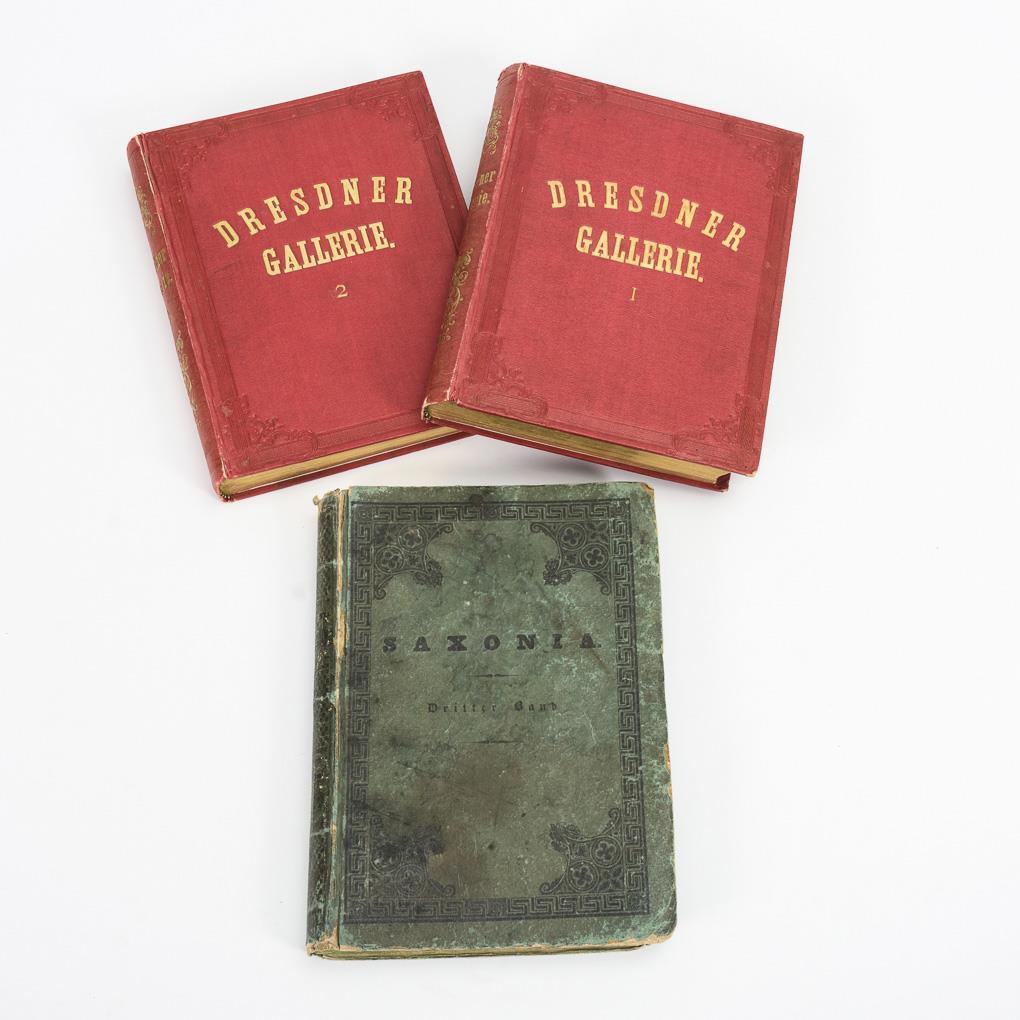 2 volumes "Dresdner Galerie" - "Der Kunstverein, Neue Serie: Stahlstichsammlung der vorzüglichsten Gemälde der Dresdner Galerie". Together 354 pages and very many steel engravings. Red embossed binding with gilt edges. Signs of wear / "Saxonia- Museum für Sächsische Vaterlandskunde" 3rd volume, Dresden 1837. 130 pages and about 66 steel engravings. Stronger signs of age and wear, 2 engravings damaged.