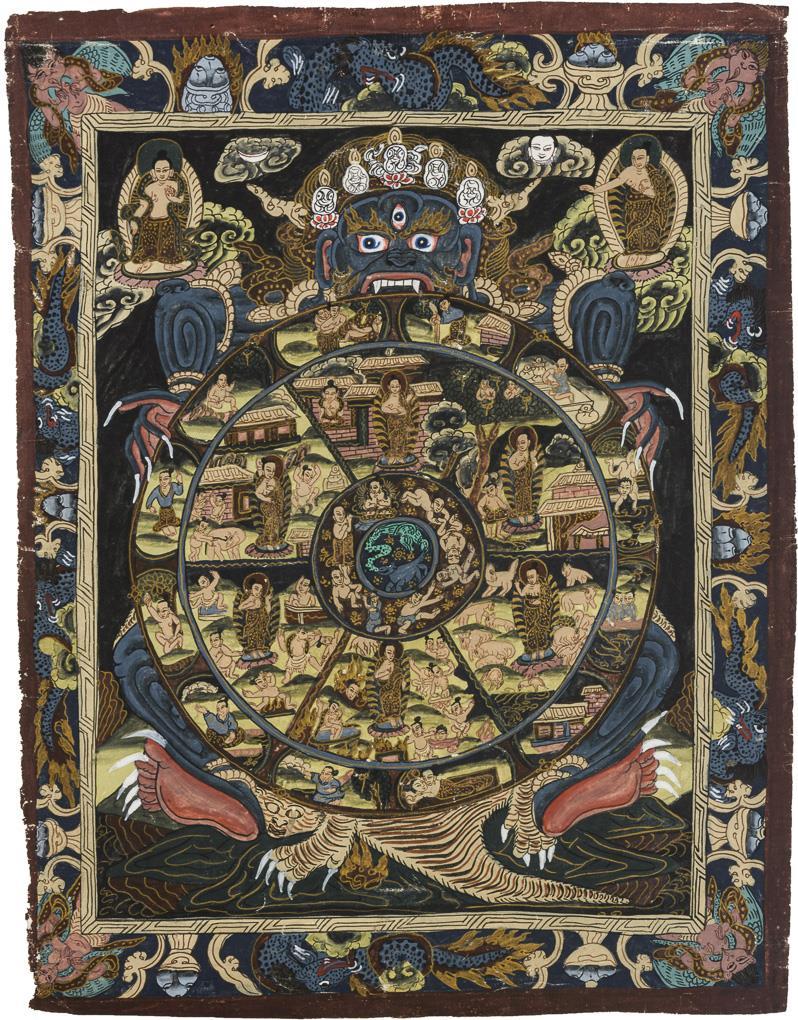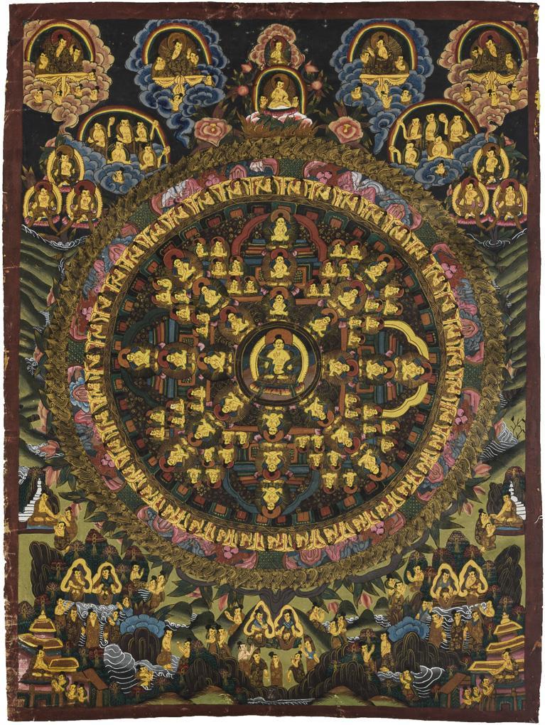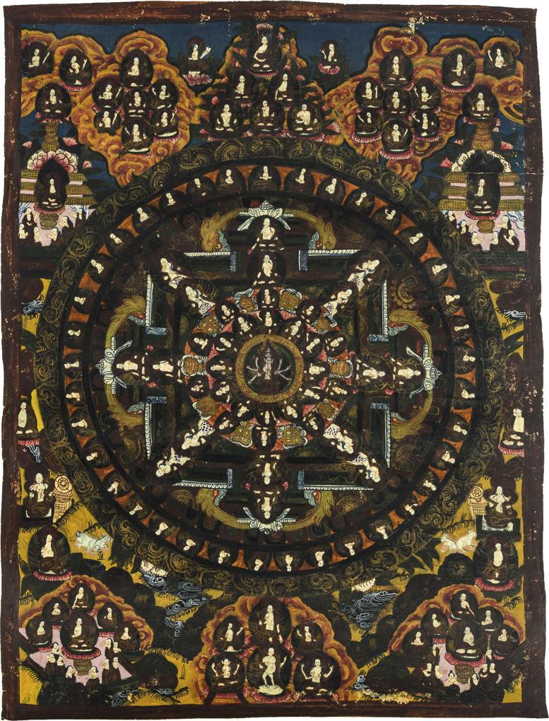 Each many-figure representations in mandala form, mainly held in dark colors.