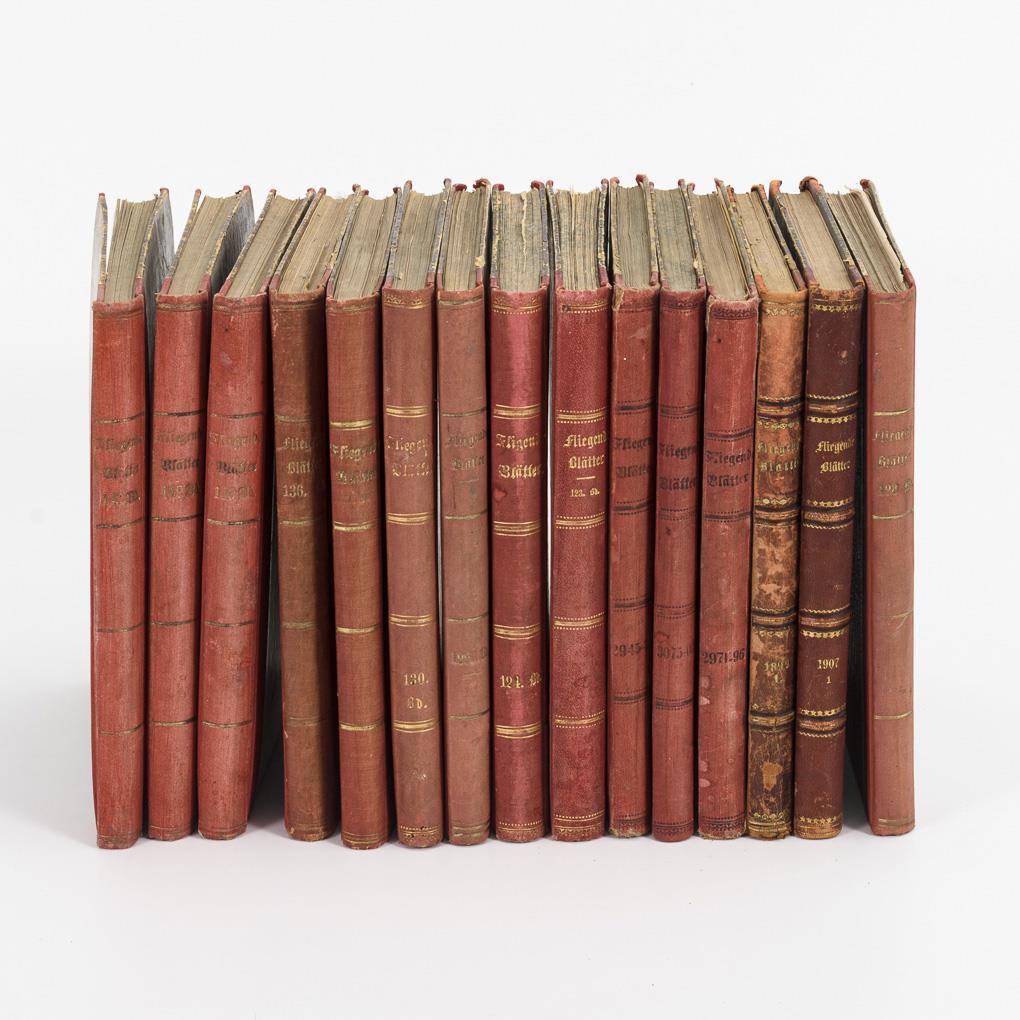 Bound caricature journals. Vol 110, 111, 117, 2x 121, 123, 124, 126, 128, 129, 130, 134, 136, 142, 143. All in similar red half cloth and half leather binding, some with heavier wear, few pages loose. Rarely offered in this volume.