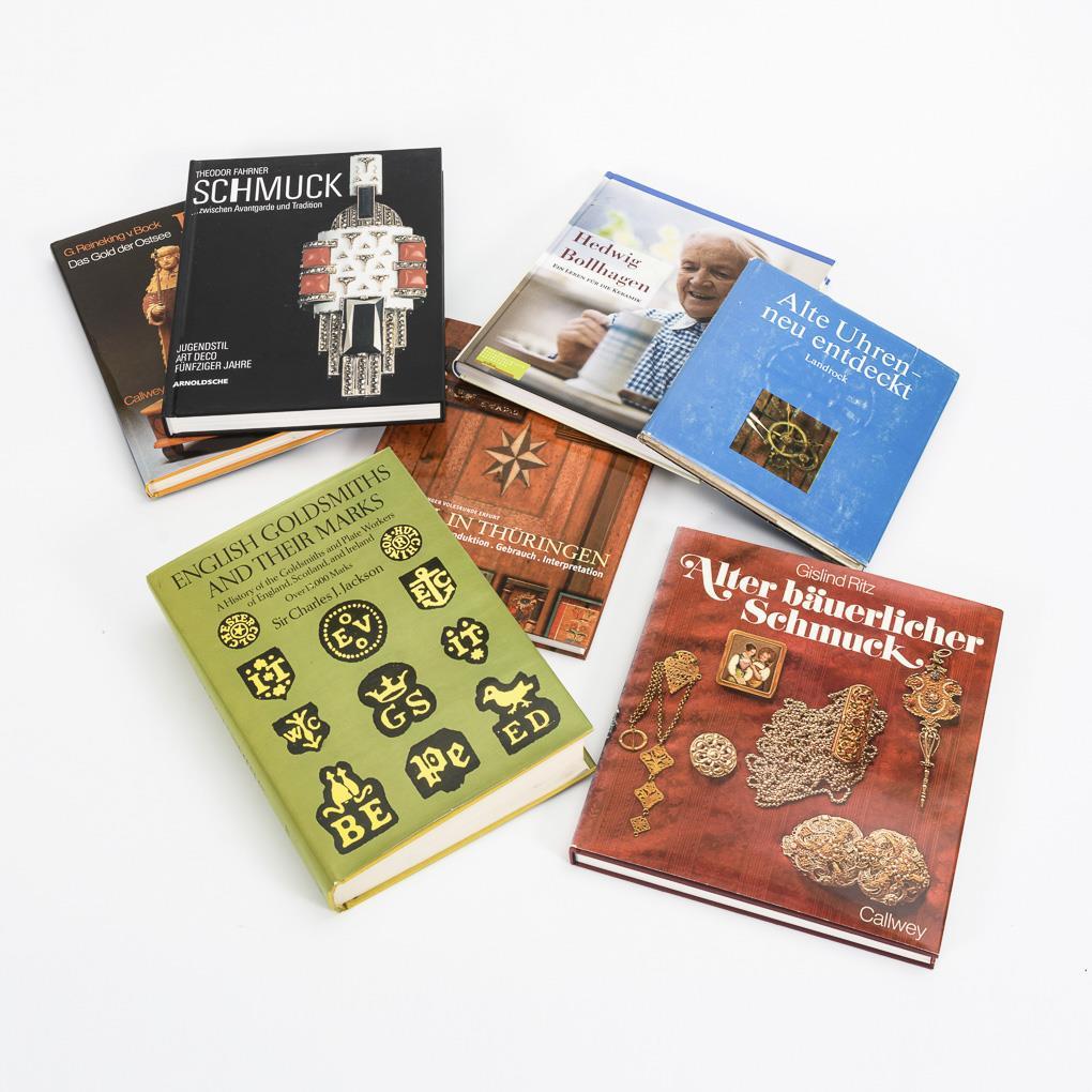 J.Jackson: "English Goldsmiths and their marks", 1921 und 1964, 747 Seiten. / Ritz: "Alter bäuerlicher Schmuck", 1978, 221 Seiten. / Reineking v. Bock: "Bernstein - das Gold der Ostsee", München 1981, 185 Seiten. / "Theodor Fahrner - Schmuck zwischen Avantgarde und Tradition", Stuttgart 2005, 288 Seiten. / "Möbel in Thüringen - Produktion, Gebrauch, Interpretation", Museum f. Thüringer Volkskunde, Erfurt 2003, 231 Seiten. / Gorka-Reimus: "Hedwig Bollhagen - Ein Leben für die Keramik", 2008, 255 Seiten. / Landrock: "Alte Uhren neu entdeckt", 1981, 160 Seiten. Alle im festen Einband mit Schutzumschlag.