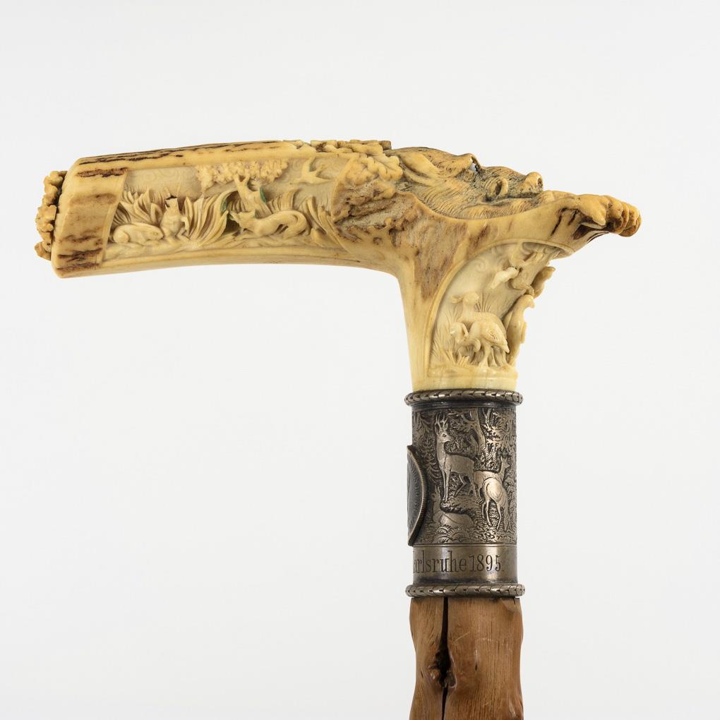 Handle carved on all sides: boar's head with glass eyes, fowl, deer with pack of hounds and hare with fox. Circumferentially finely engraved silver cuff with hunter and a jumping deer and engraving "Karl Tröster Karlsruhe 1895". On it applied silver coin "Republica dos Estados unidos do Brazil 1889". Minimal hairline cracks, missing parts and additions to the antlers, hairline cracks in the wood.