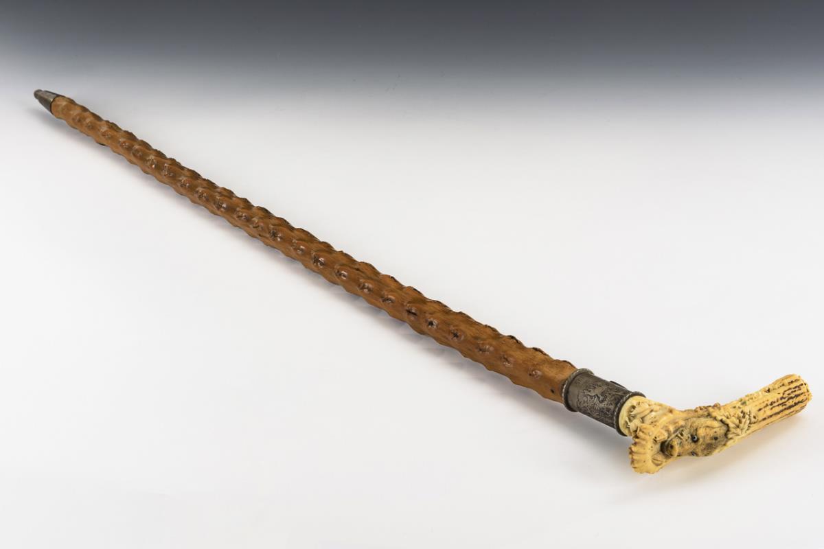 Antlery, silver (checked), wood, iron ferrule. L 90 cm.