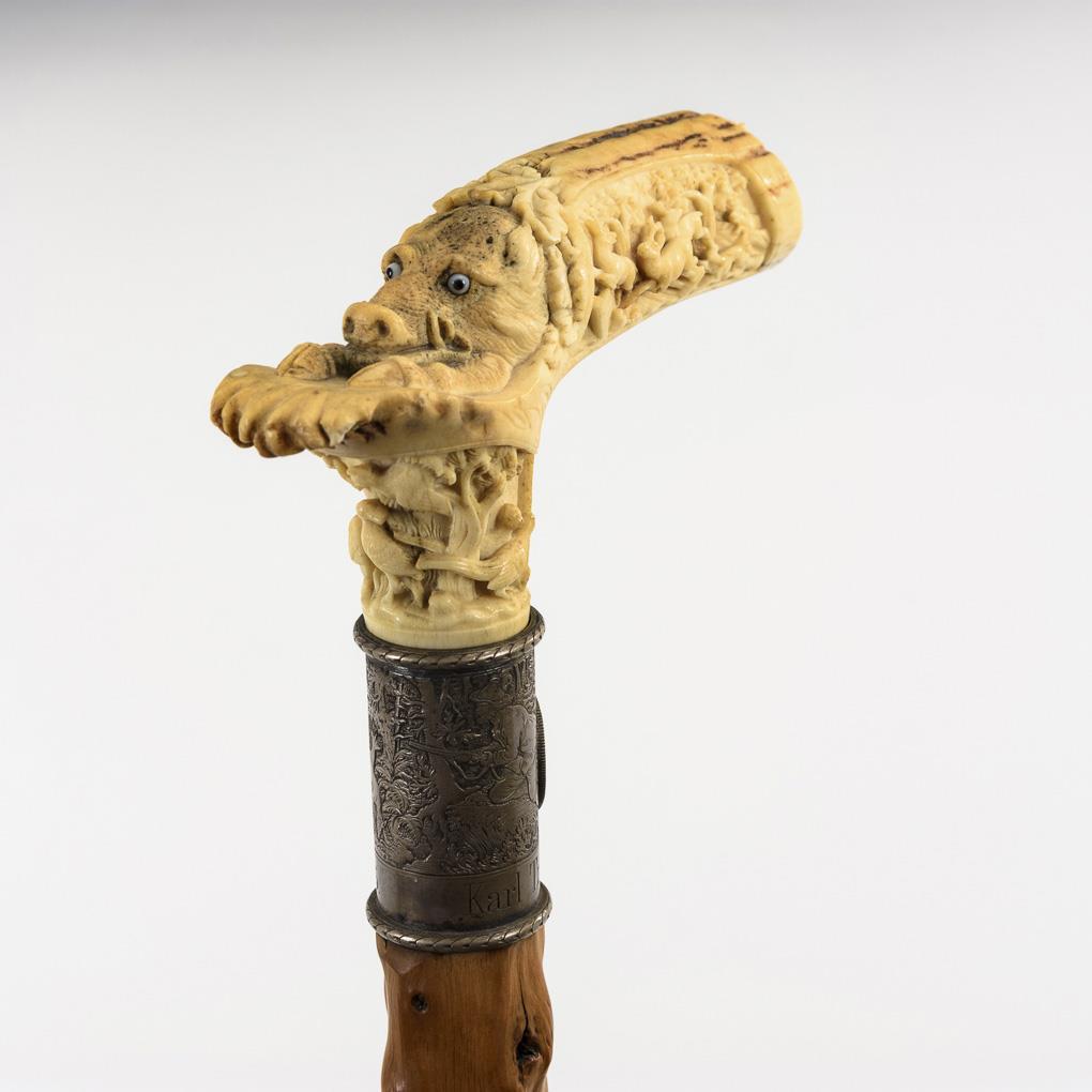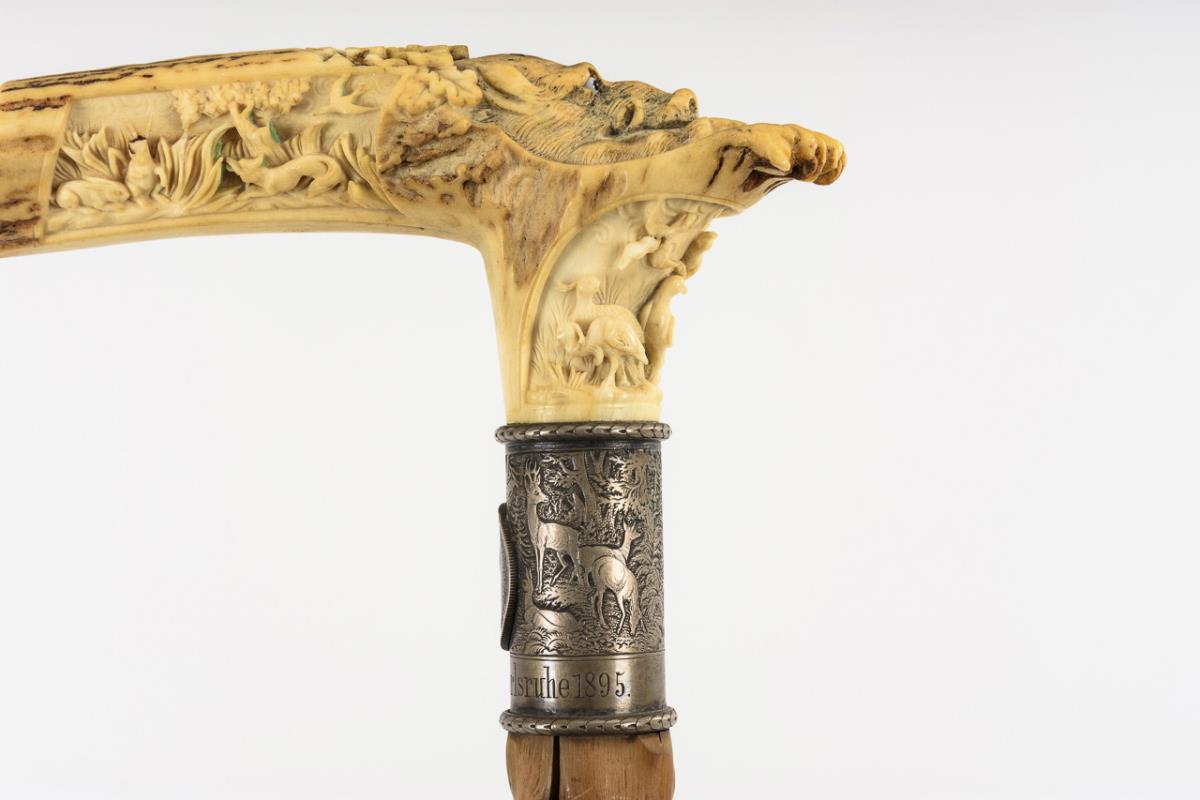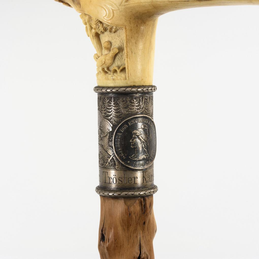 Handle carved on all sides: boar's head with glass eyes, fowl, deer with pack of hounds and hare with fox. Circumferentially finely engraved silver cuff with hunter and a jumping deer and engraving "Karl Tröster Karlsruhe 1895". On it applied silver coin "Republica dos Estados unidos do Brazil 1889". Minimal hairline cracks, missing parts and additions to the antlers, hairline cracks in the wood.