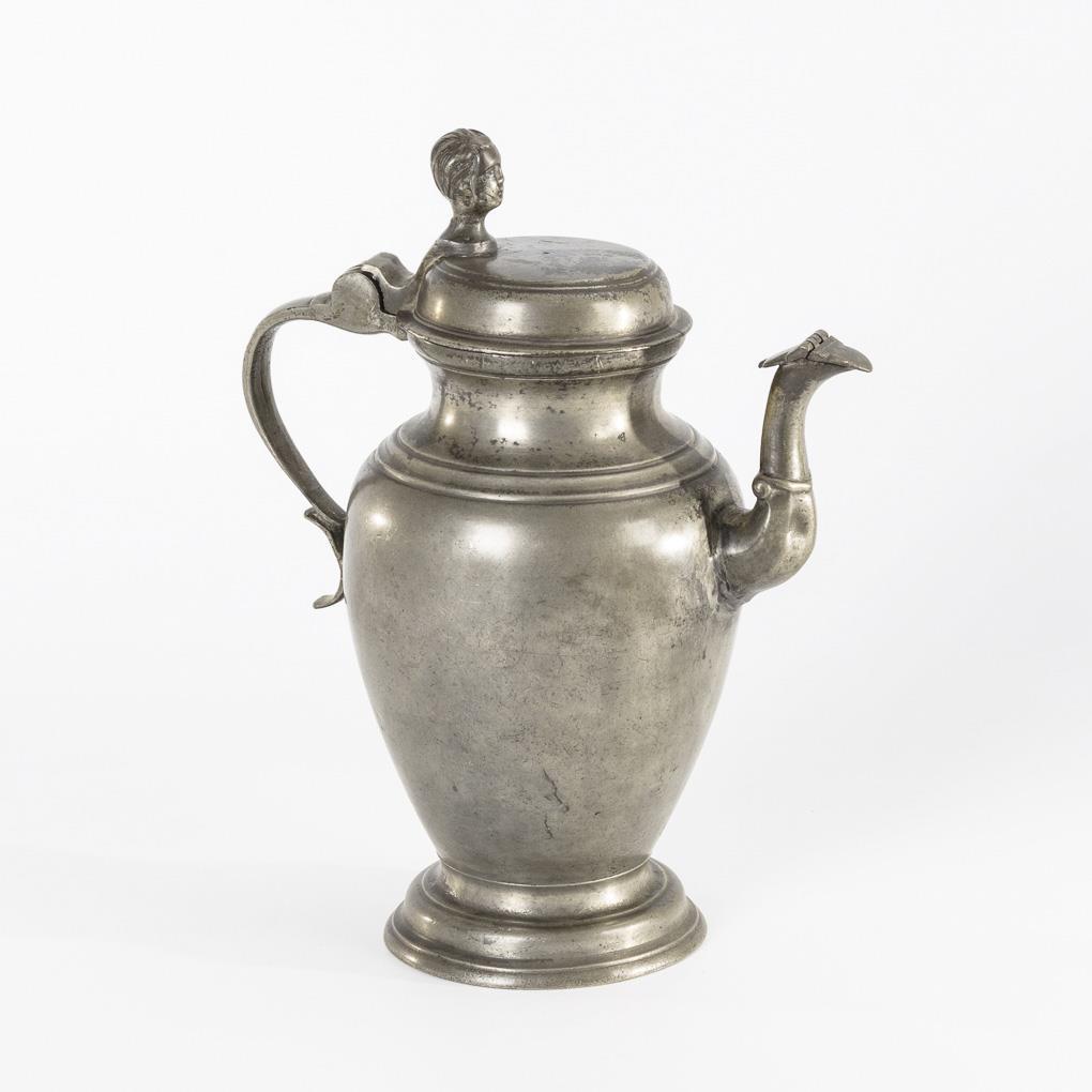 Ovoid jug with hinged lid on spout and gentleman's head as pusher. Head supplemented, solder marks on lid and handle base, dent on spout, otherwise a few signs of age/use.
