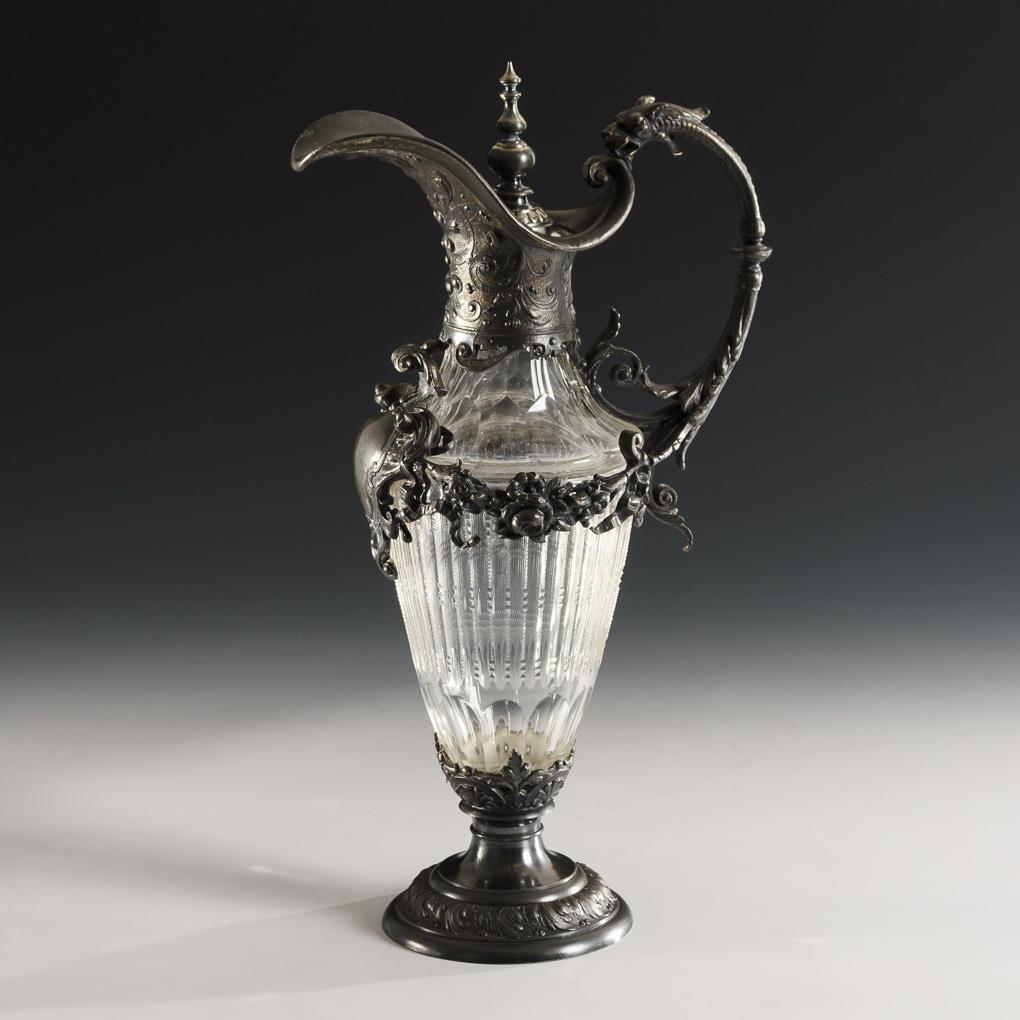 Ovoid jug with facet cut at base and shoulder, fluted wall with scalloped cut edges. Metal mounted foot, shoulder with flower festoons and escutcheon and muzzle, handle with tiger head.