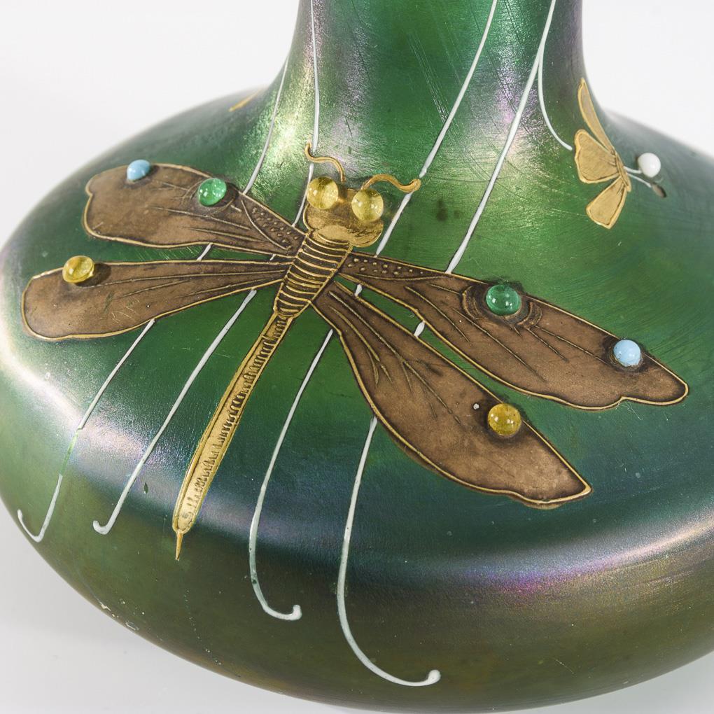 Depressed bulbous vase with crater neck. On the front a gold and copper painted dragonfly with applied coloured glass cabochons. Minimal gold rubbing.