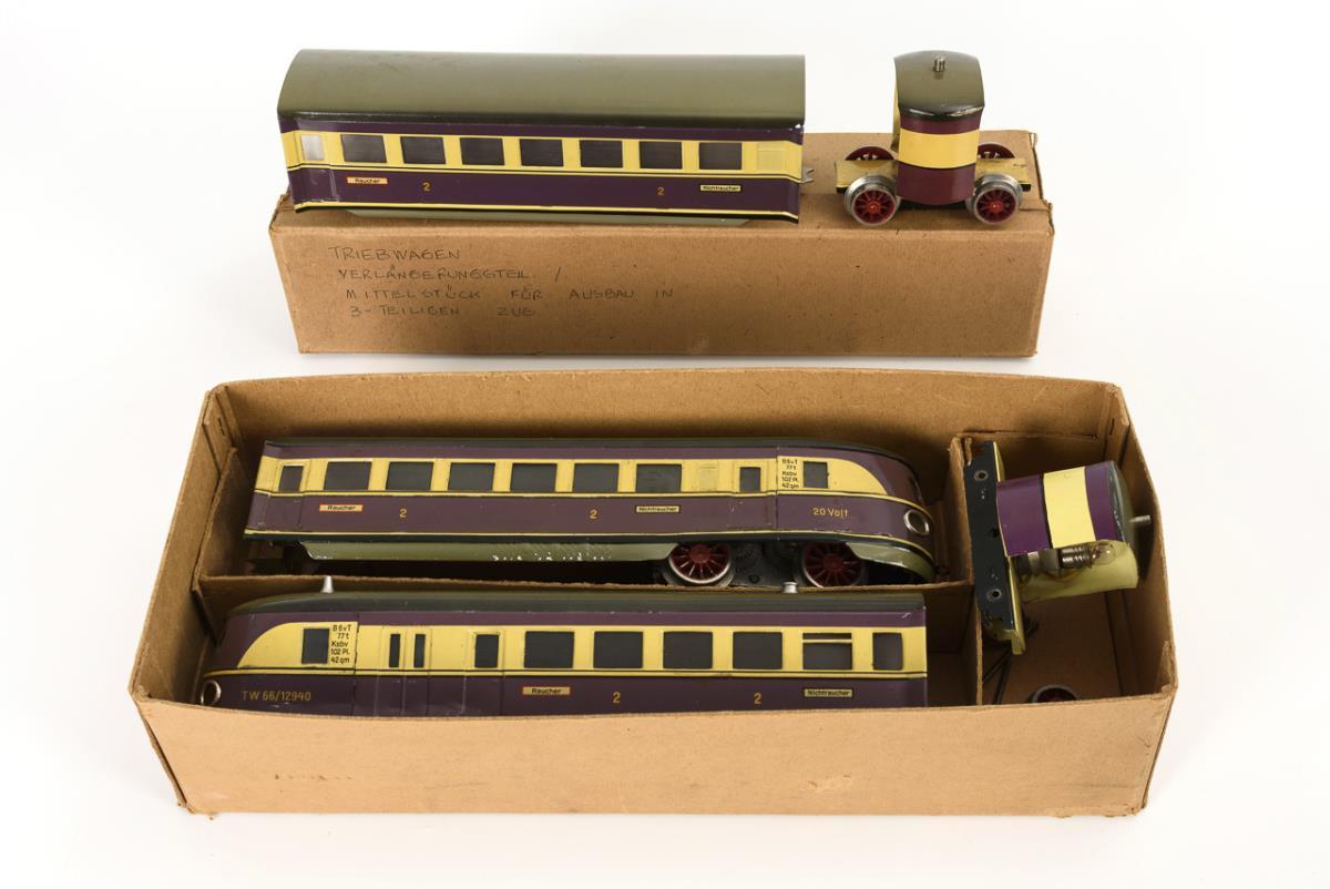 Gauge 0. Purple-yellow paint scheme. 2 powered rail cars and associated center section or connecting piece for removal in 3-part train. In 2 original boxes
