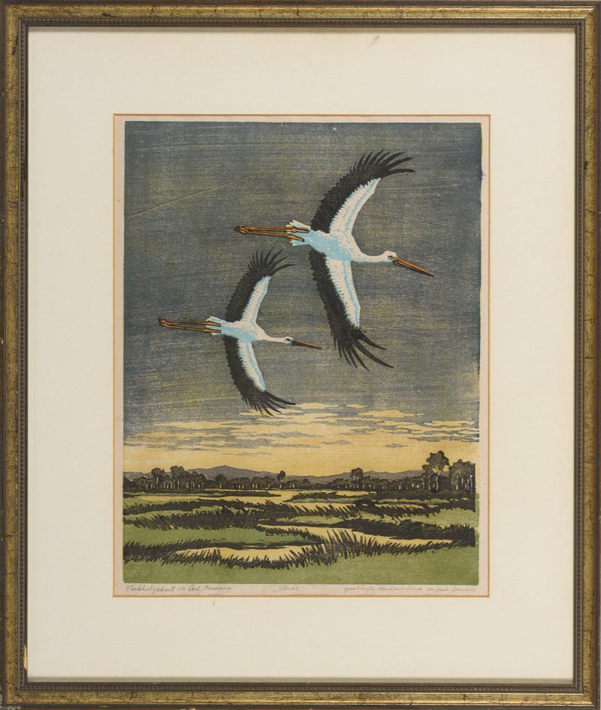 Color woodcut on Japan paper. Inscribed in pencil "color woodcut by Carl Thiemann", "approved hand reprint by Linda Brembuch".