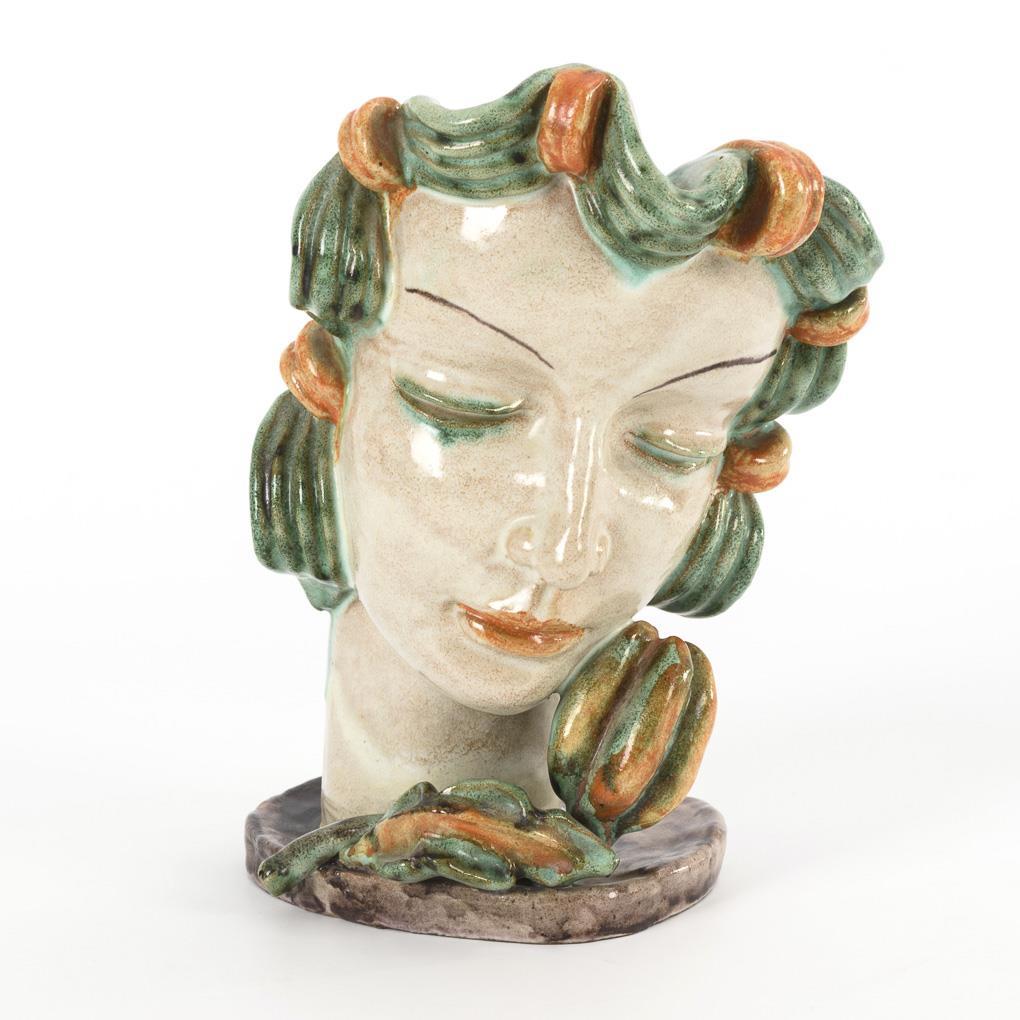 Art Deco woman's head with hair ornament and flower, on base. Verso partially hair cracked.