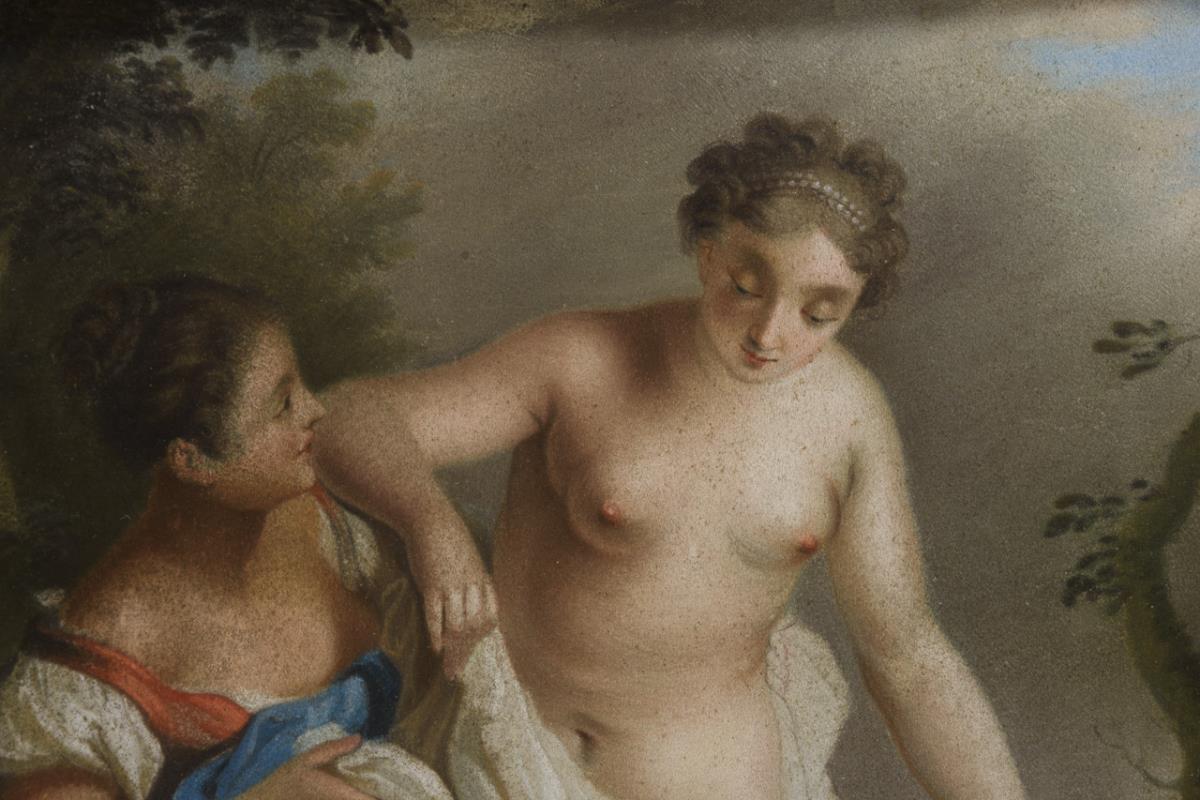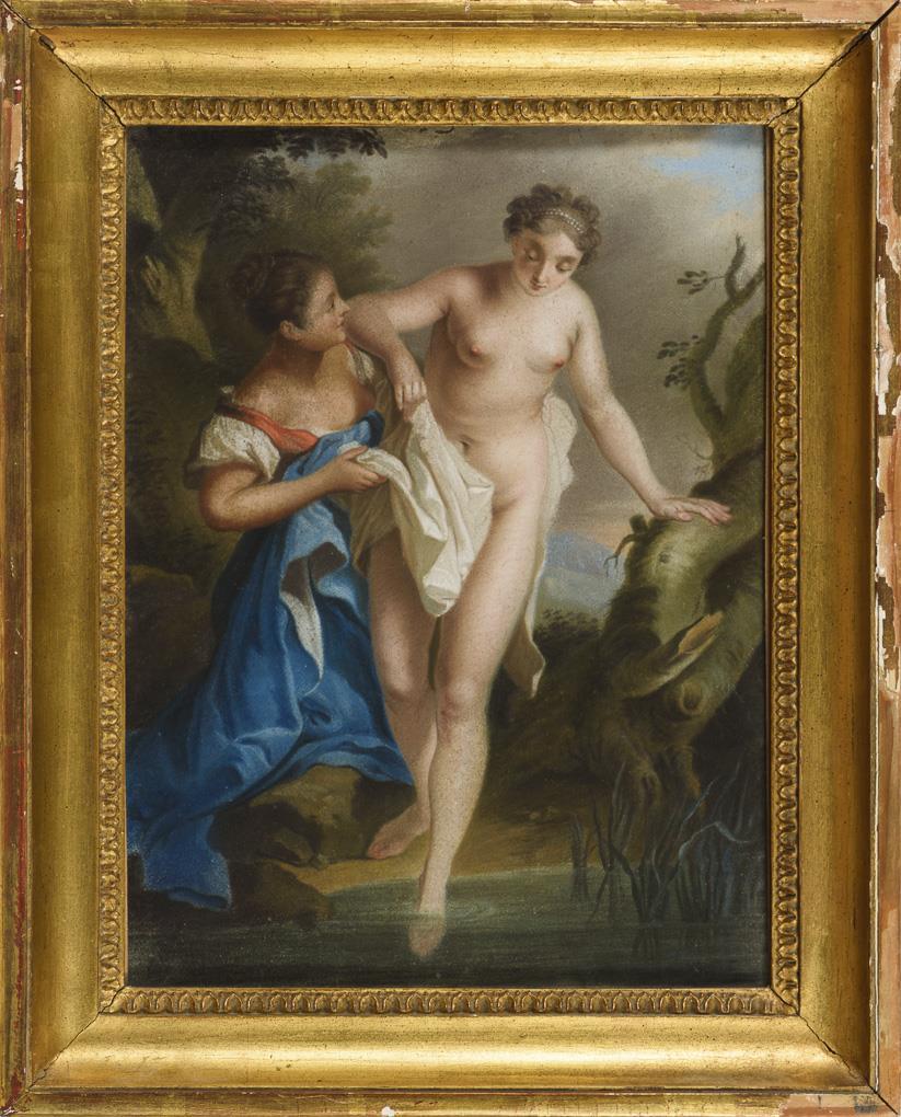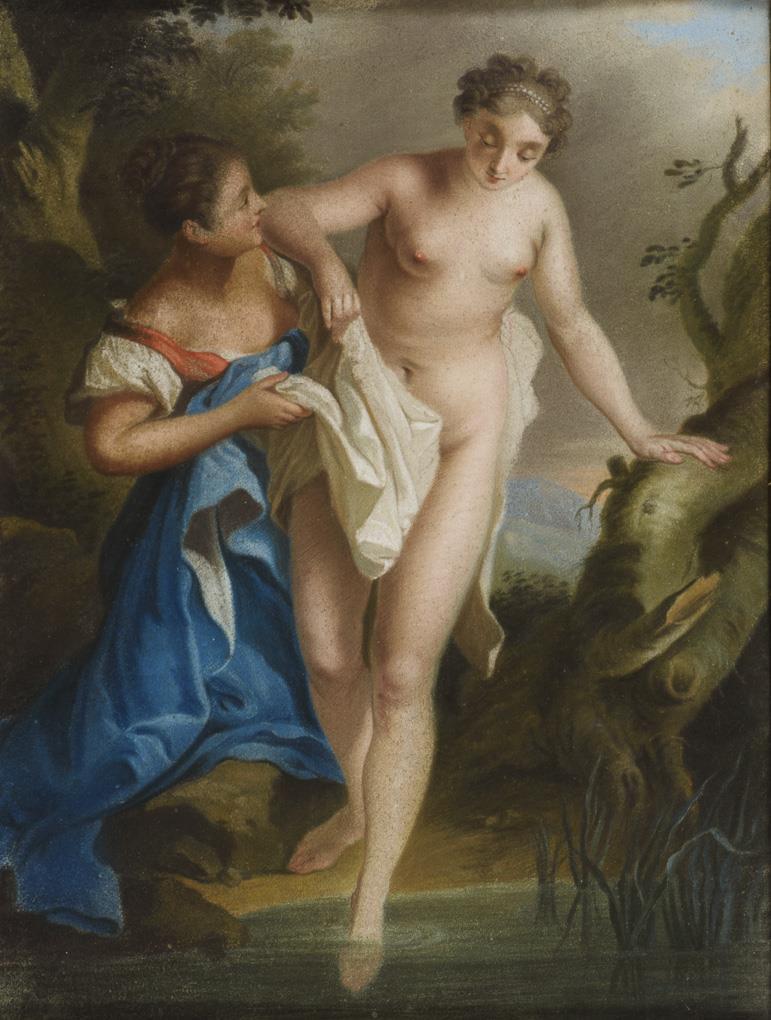 Nude woman with maid on the bank of a lake under cloudy sky. Minimal traces of age.