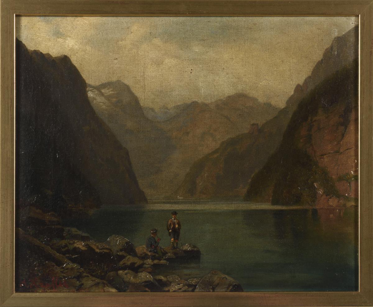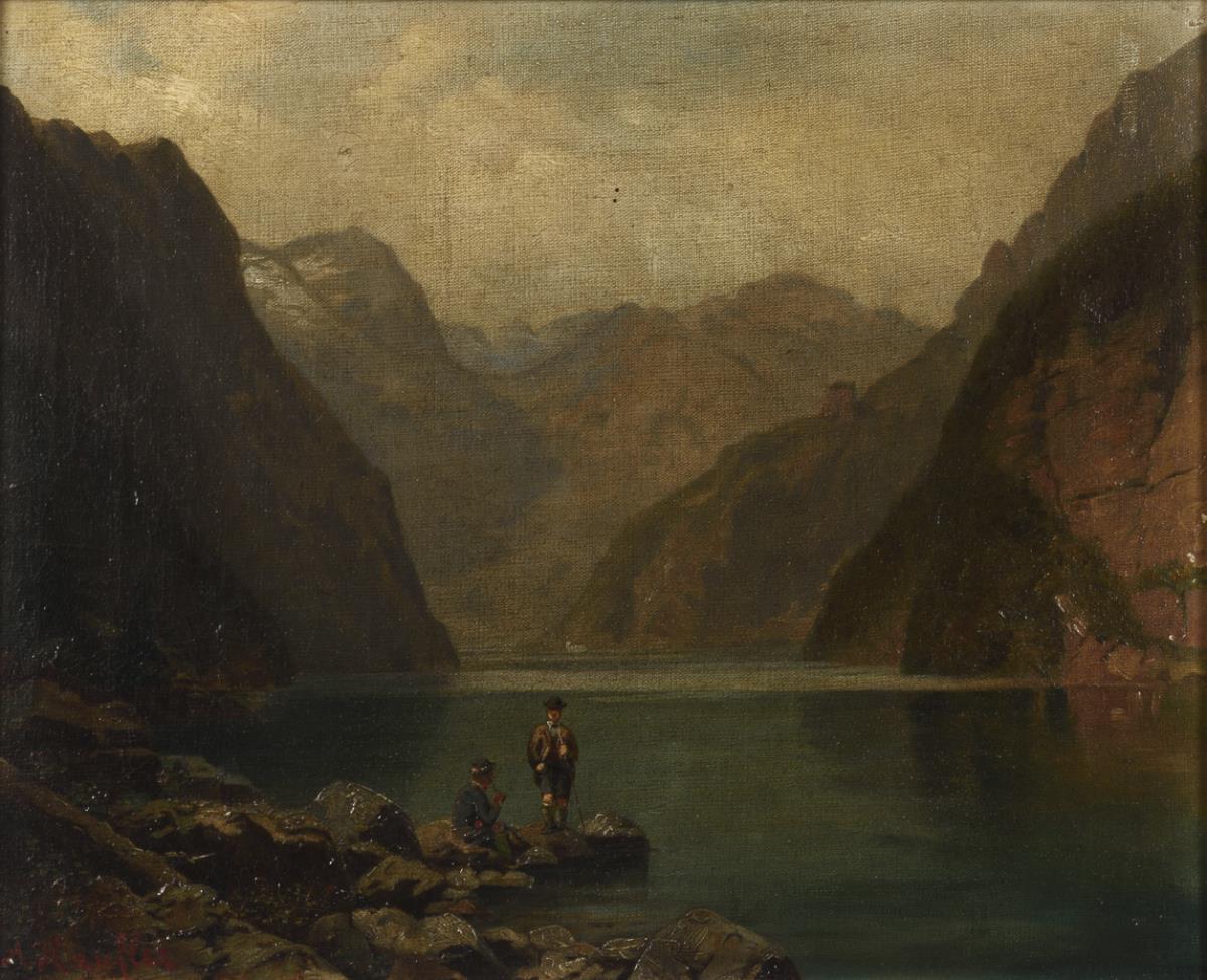 Staffage figures at the lakeside on a sunny day. Slight signs of age.