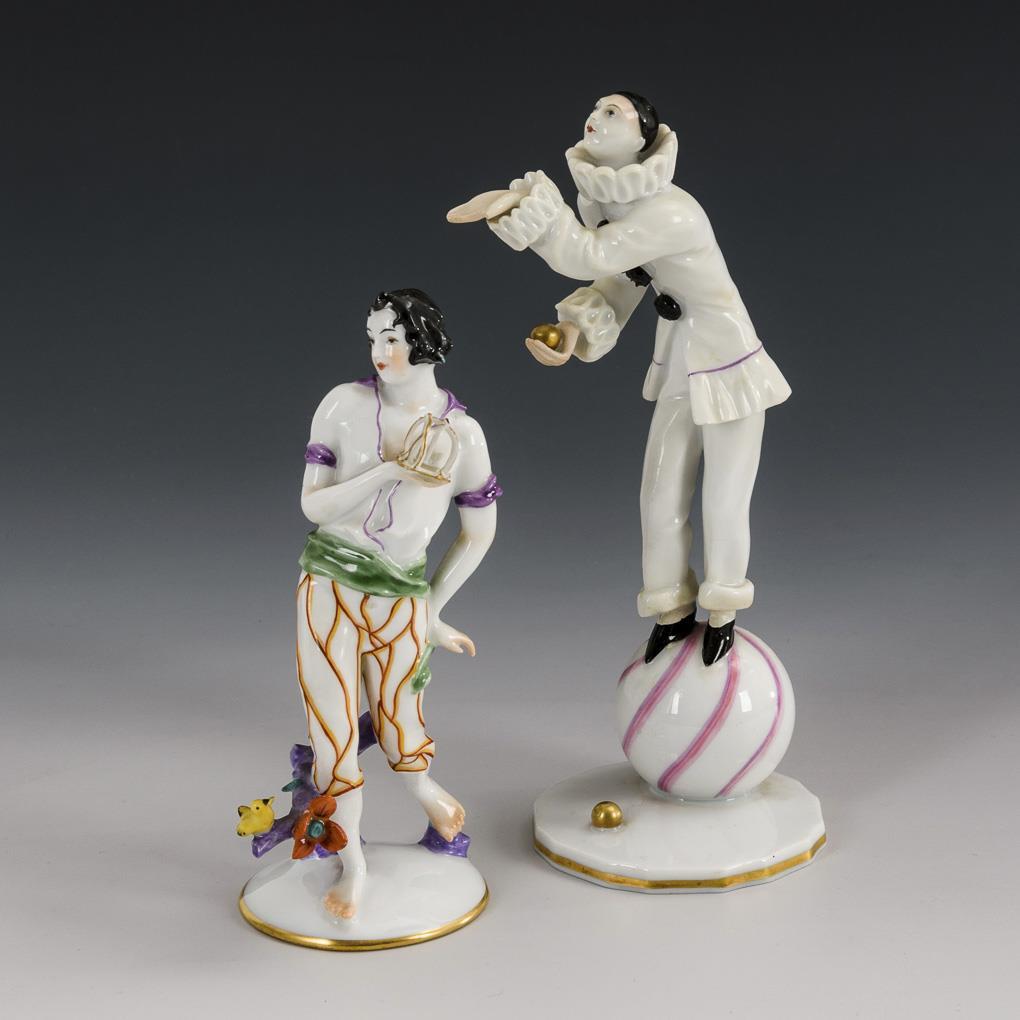 1x harlequin balancing on a ball. / 1x youth with birdcage. Birdcage defective, feet of harlequin restored, 2 fingers bumped.