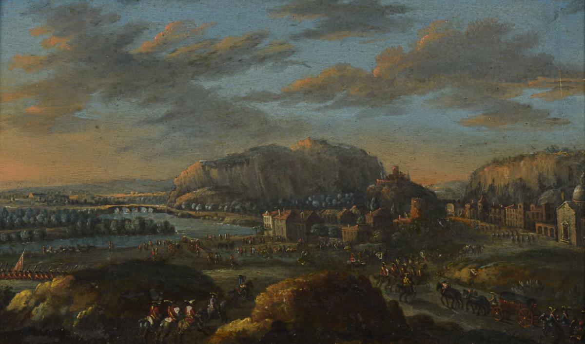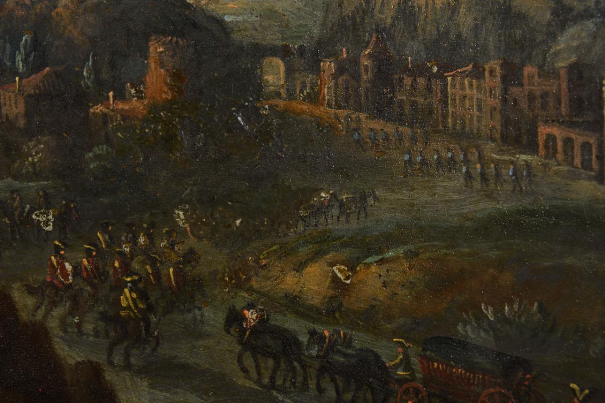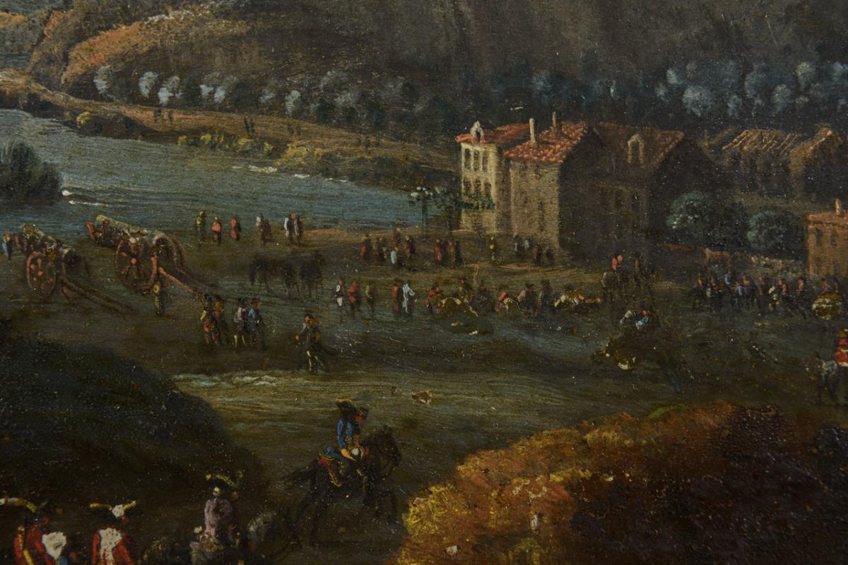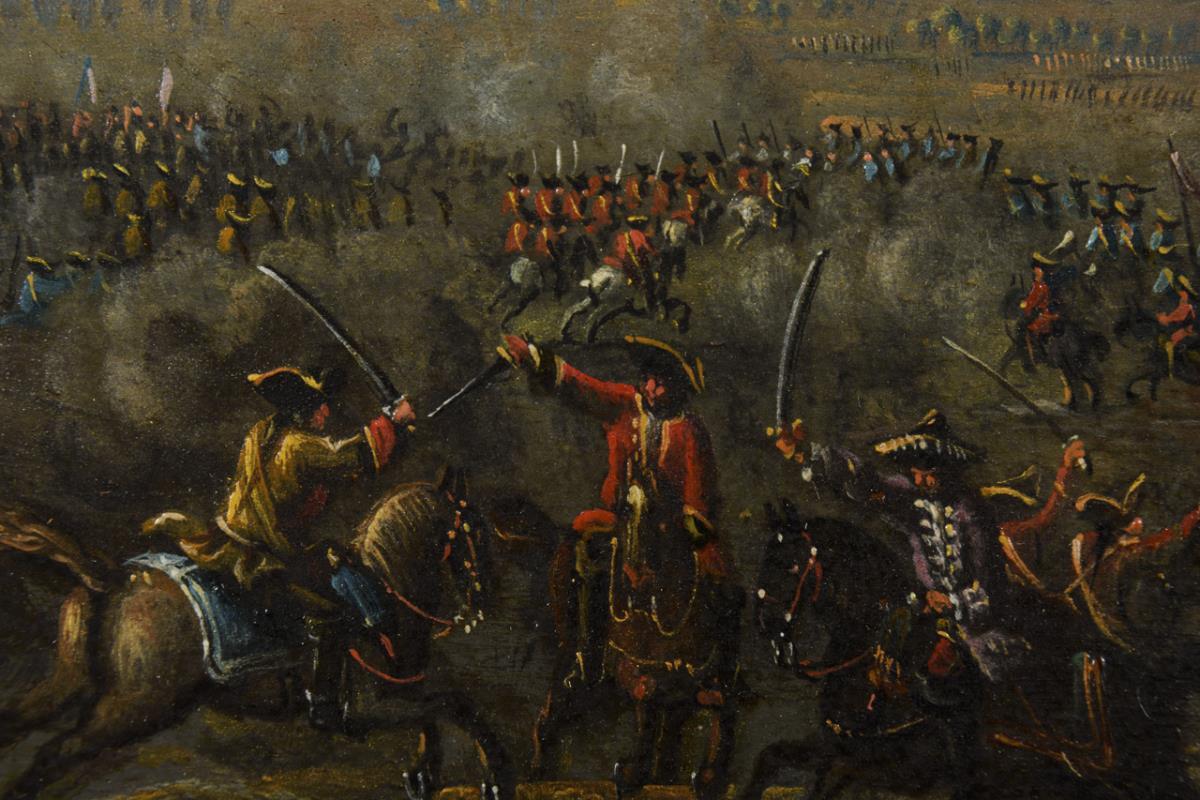 Each depicting a wide landscape with two armies in battle. Each slight signs of age.
