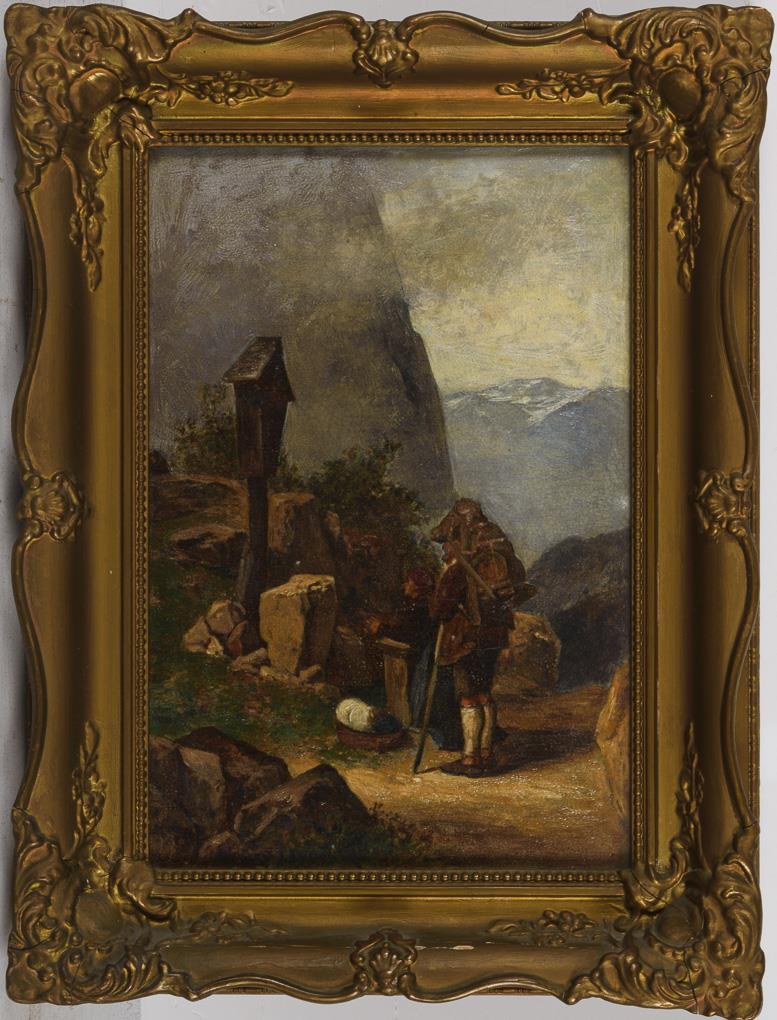 Elderly couple in prayer before the wayside shrine in the mountains.