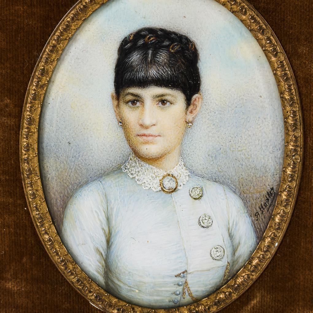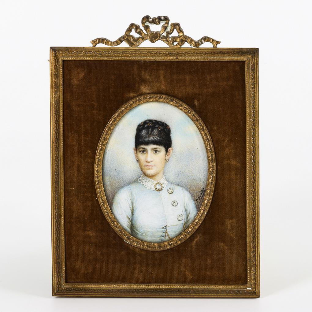 Probably tempera, glazed, in velvet passepartout, with brass border and bow crowning. 8 x 6 cm, frame 15.5 x 11.5 cm.