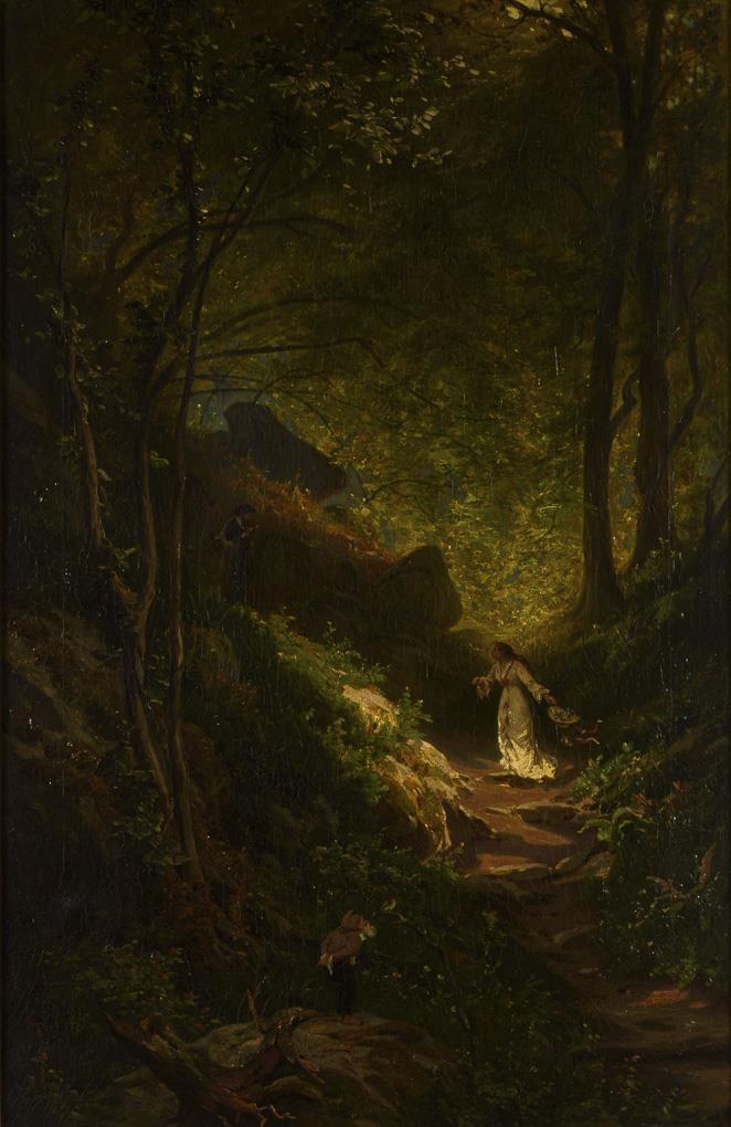 You are here:   Home Categories Paintings Kiesling, Ernst: Genreszene mit Zwerg und Specht und paar im Wald