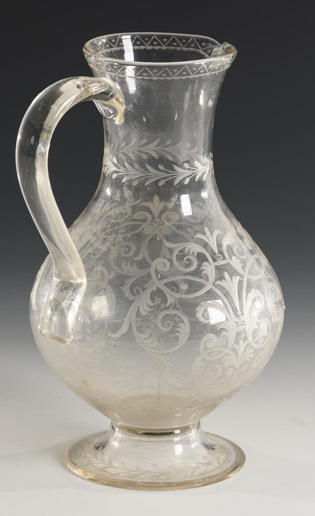 Pear jug with ribbon handle and round foot. Finely engraved in the style of Lobmeyr with a floral-ornamental decor.