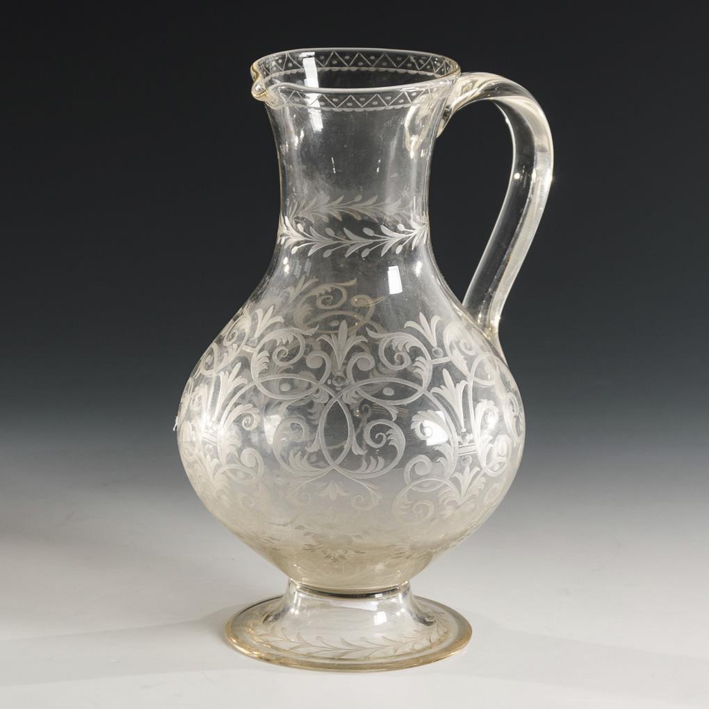 Pear jug with ribbon handle and round foot. Finely engraved in the style of Lobmeyr with a floral-ornamental decor.