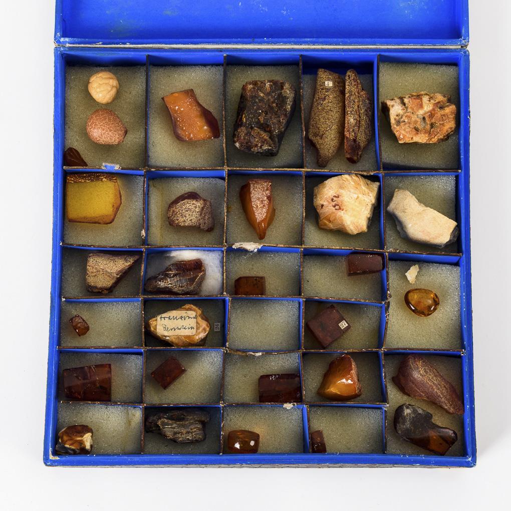 31 voucher pieces on the history of amber. Partly polished and partly with insect inclusions, partly with number. Case with some signs of age / use.