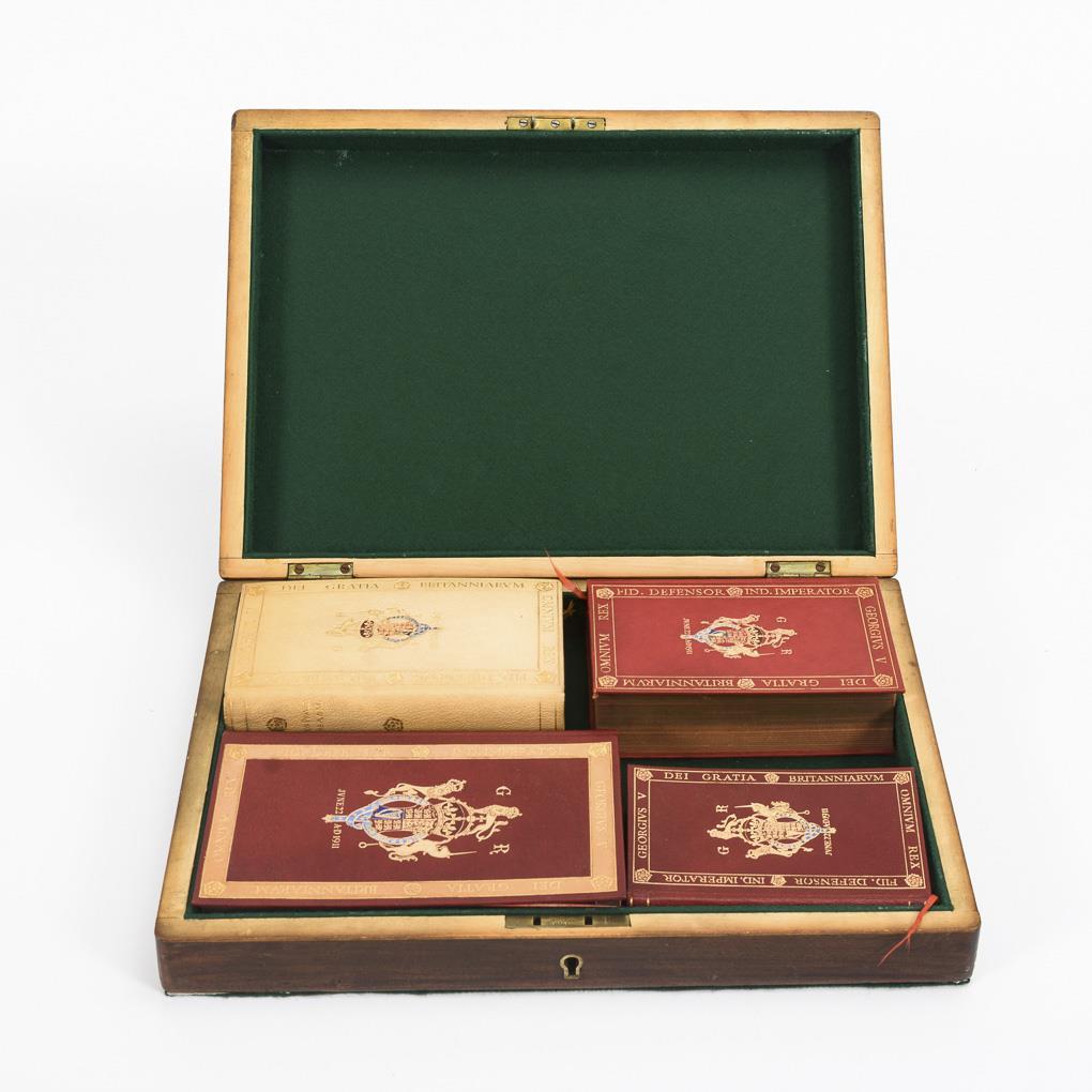 "The form and order of the service that is to be performed and of the ceremonies that are to be observed in the coronation ...", intaglio in black and red on untrimmed laid paper, 43 pages. In gilt-stamped cloth binding. Oxford: Horace Hart, M.A., Printer to the University / "The Holy Bible", Oxford, printed at the university press / 3 different editions "The book of Common Prayer and administration of the sacraments ... the church of England," Oxford. All in fine leather binding with gold embossing and gilt edges and George V's coat of arms. / Wooden box with brass inlay, without key. Bible with torn endpapers at the joint, otherwise fine. Hardly any signs of use.