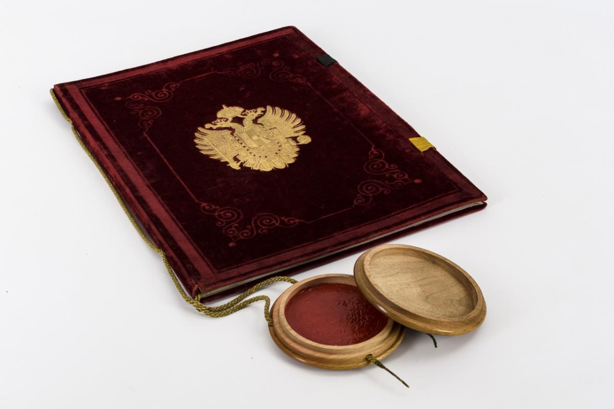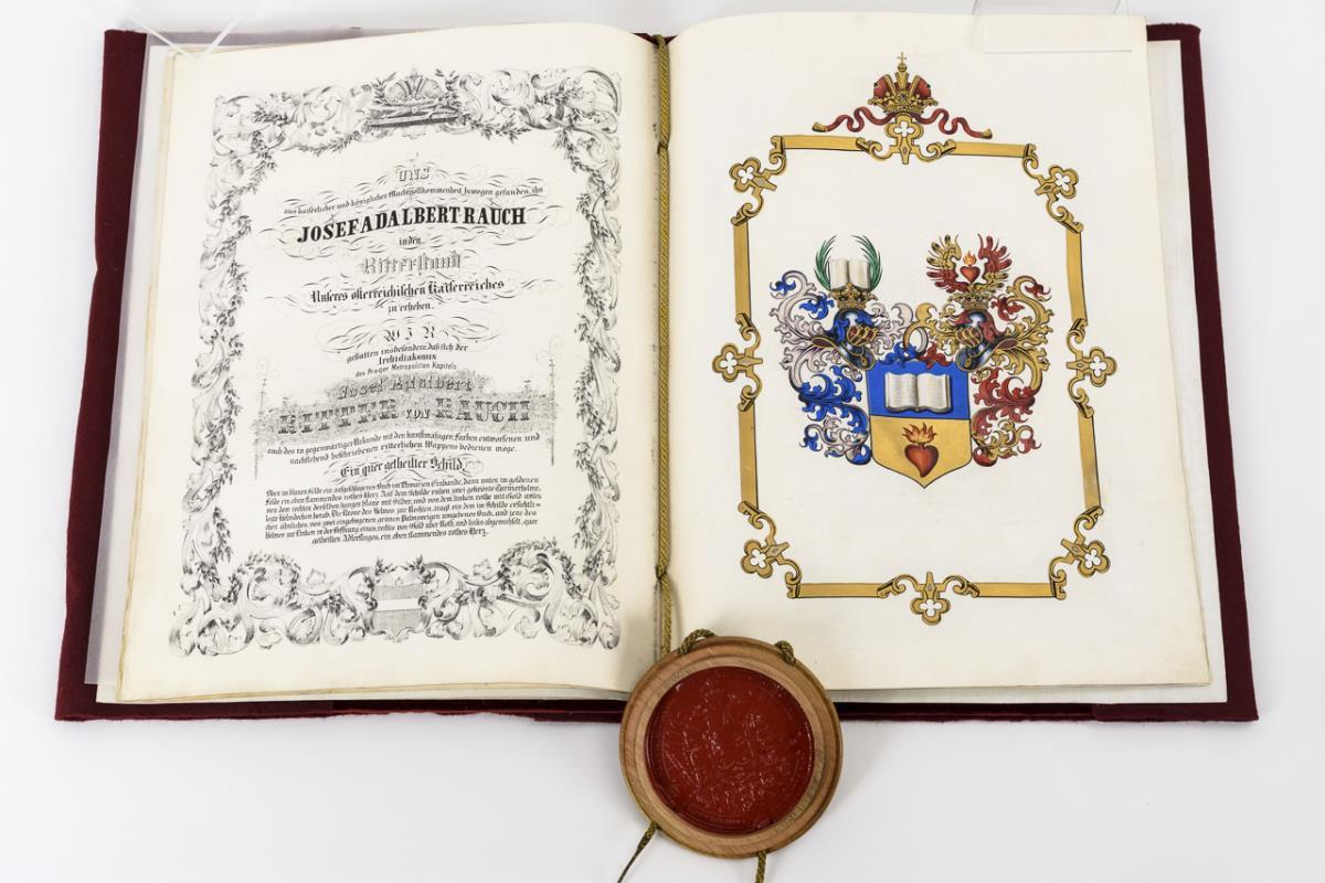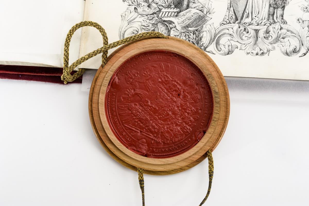 Red velvet binding with blind and gold embossing and velvet clasps, walnut seal capsule on cord cord with coat of arms seal, lithograph title page and page borders, calligraphy and painted coat of arms (4 vellum pages). In modern dust jacket. 38 x 29 cm.