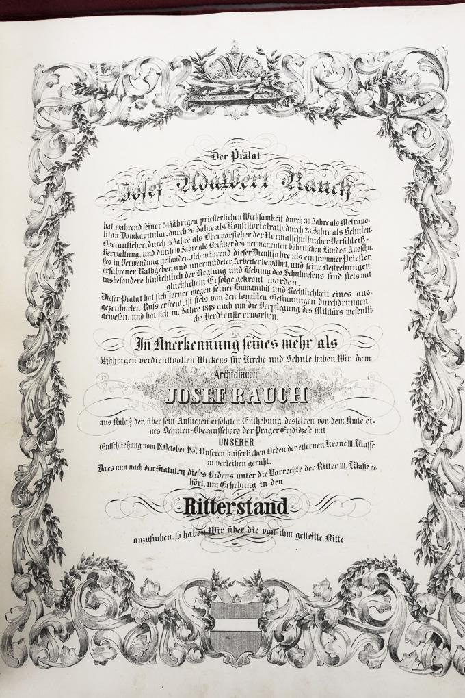 Elevation to knighthood made under the Emperor Franz Joseph I of Austria by Joseph Adalbert Rauch, Cathedral Archdeacon of Prague. Signed by Alexander Freiherren von Bach 1858. Scarcely signs of age / wear.