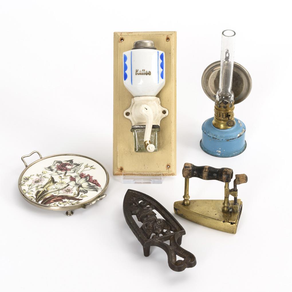 Wall coffee grinder, kerosene lamp, iron with cast iron base, ceramic cake plate. Traces of age, paint defects.
