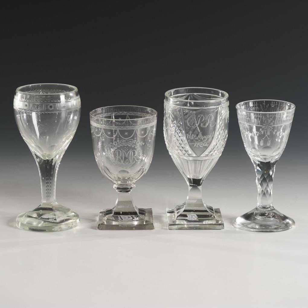 4 different glasses, including 2x with round foot and 2x with square foot, all with faceting and engraved decoration, 1x with notch, flat and stonel cut as well as the engraving "CRR d. 18. August 1820", 1x with the monogram "RMR". Partially with small bumps at the foot or mouth rim, 1x stress crack in the foot.