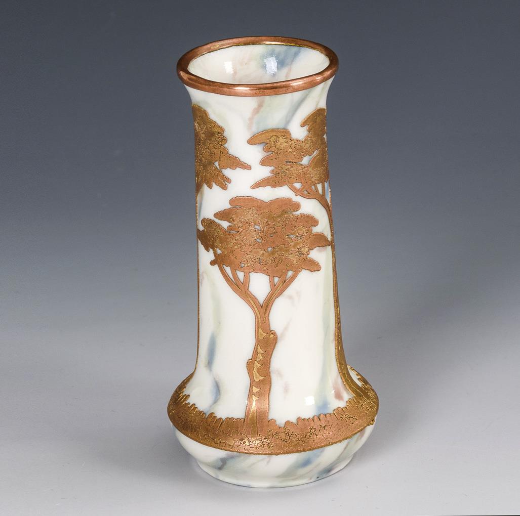 In the mass colored, marbled porcelain with galvanic copper overlay in the form of trees. H 11,5 cm.