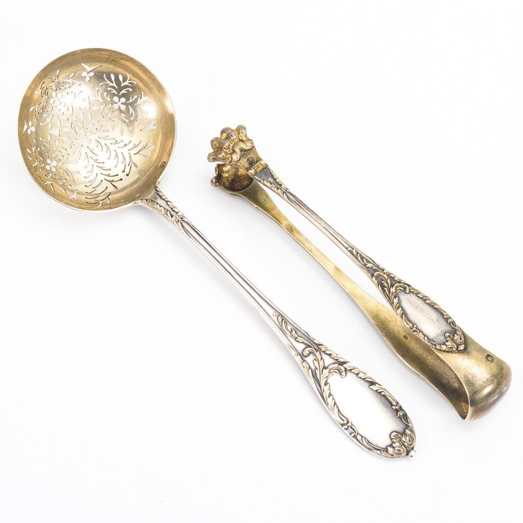 Skimmer spoon with filigree openwork spoon, tongs with claw handles, leaf-relief decor. Slight signs of age and use.