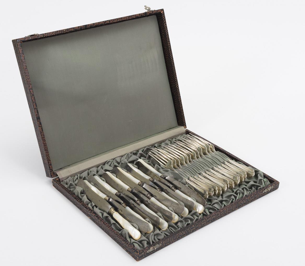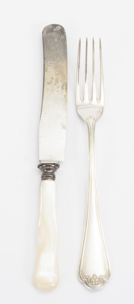 12 forks with thread reliefs and ligatured monogram, 12 knives with mother-of-pearl handle and steel blade.