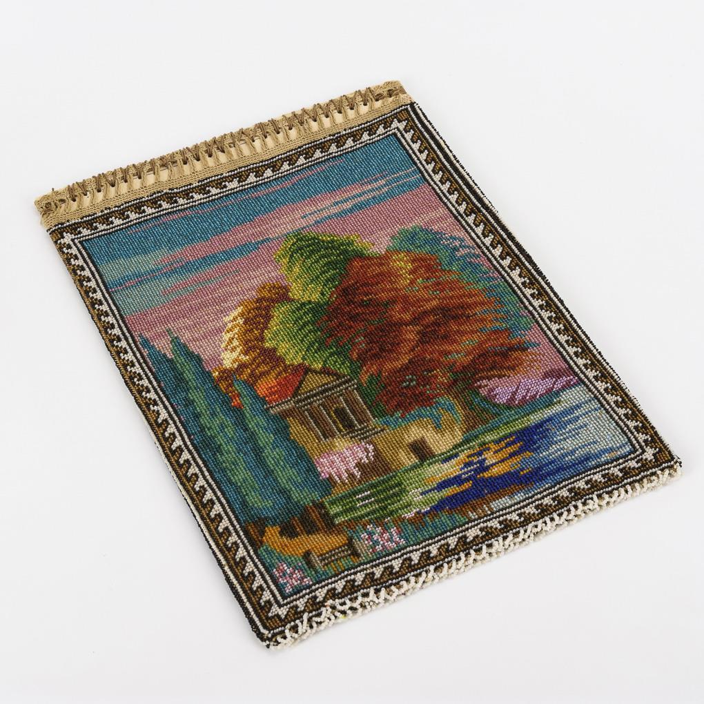 Probably hand-knitted; with colored glass beads. Mounted on cardboard. 27 x 19.5 cm.