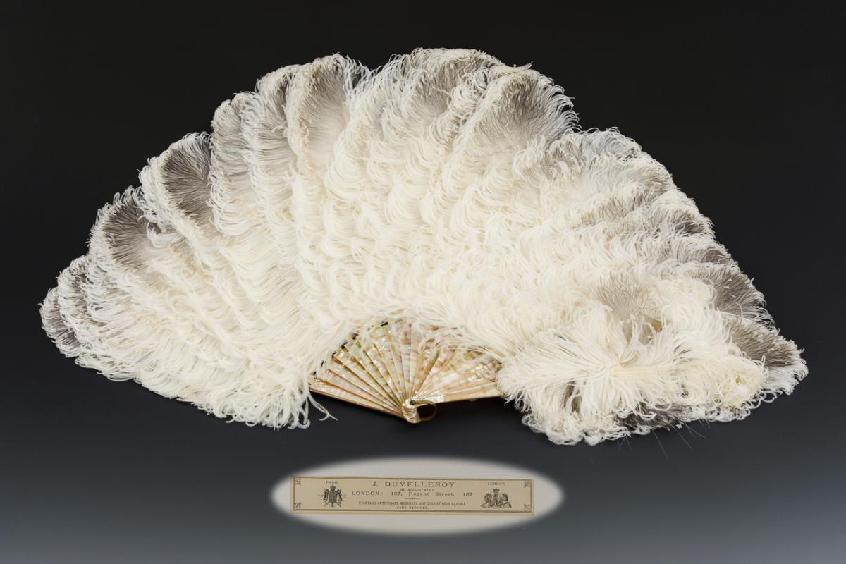 Mother-of-pearl, white feathers with gray tips, brass temples. Wooden box with white fabric cover. L 47 cm (without temples).
